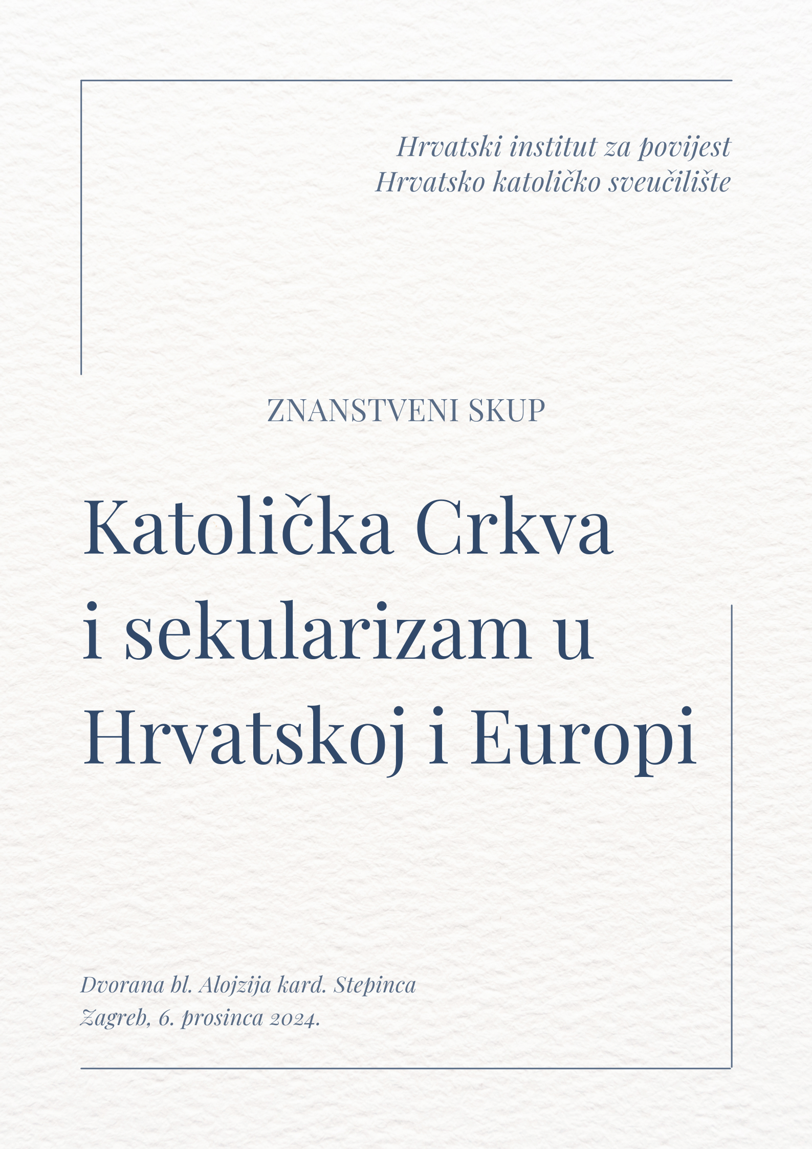 Hrvatsko katoličko sveučilište i Hrvatski institut za povijest organiziraju znanstveni skup Katolička Crkva i sekularizam u Hrvatskoj i Europi koji će se održati u petak 6. prosinca 2024. u Dvorani blaženog Alojzija kardinala Stepinca na Hrvatskom katoličkom sveučilištu u Zagrebu (Ilica 244, ulaz iz Domobranske ulice). Cilj skupa je interdisciplinarnim pristupom razmotriti složenu dinamiku između Katoličke Crkve i sekularizma, analizirati povijesni razvoj, modele sekularnosti u Hrvatskoj i Europi, te suvremene izazove u odnosima vjerskih zajednica i sekularnog društva.