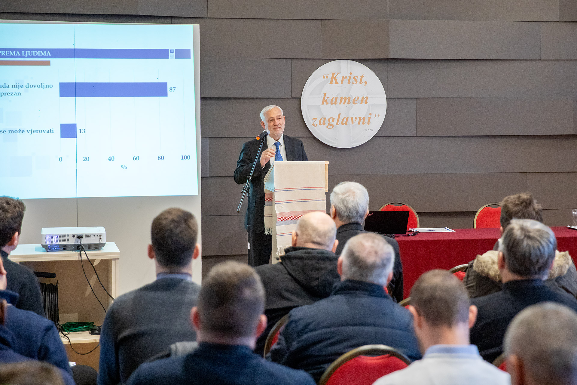 Poručio je i kako suvremeni svijet gubi želju za dijalogom te ga zamjenjuje polemikom u kojoj je cilj pobijediti protivnika, a ne doći do zajedničkog razumijevanja. U nastavku je predstavio podatke koji se odnose na razdoblje od 1999. do 2018., a tiču se povjerenja Hrvata prema institucijama, uključujući Crkvu, religioznost stanovništva, odlazak na misu, osobnu molitvu i slično.