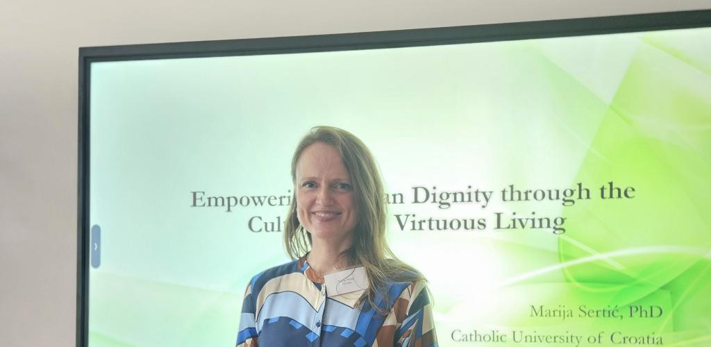 Assoc. Prof. Marija Sertić, from the Department of Theology at the Catholic University of Croatia, gave a lecture and workshop at the international EFTRE 2025 (European Forum of Teachers of Religious Education) conference, held in Budapest from 21 to 24 August 2025. Her presentation and workshop were titled “Empowering Human Dignity through the Cultivation of Virtuous Living.”