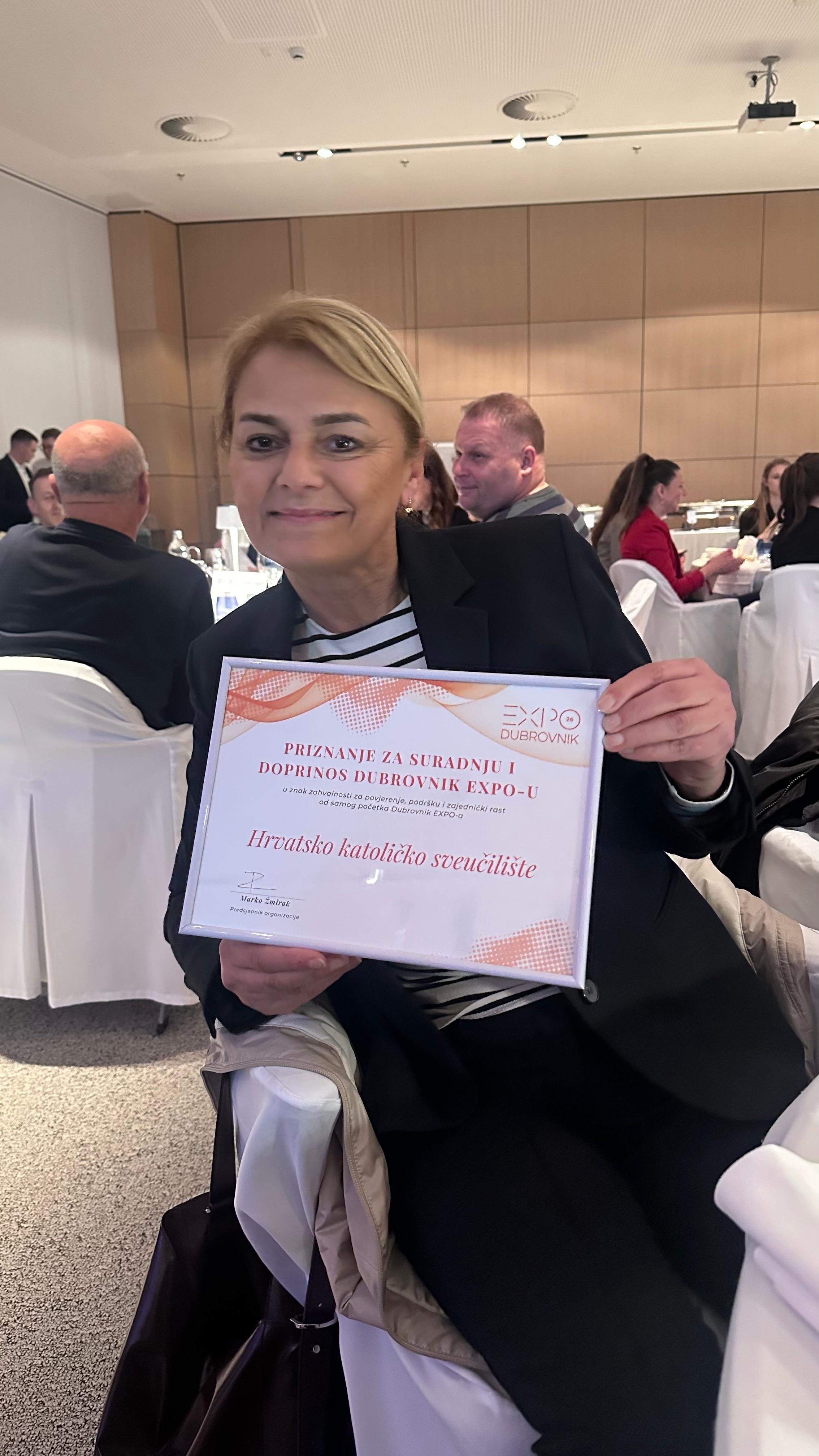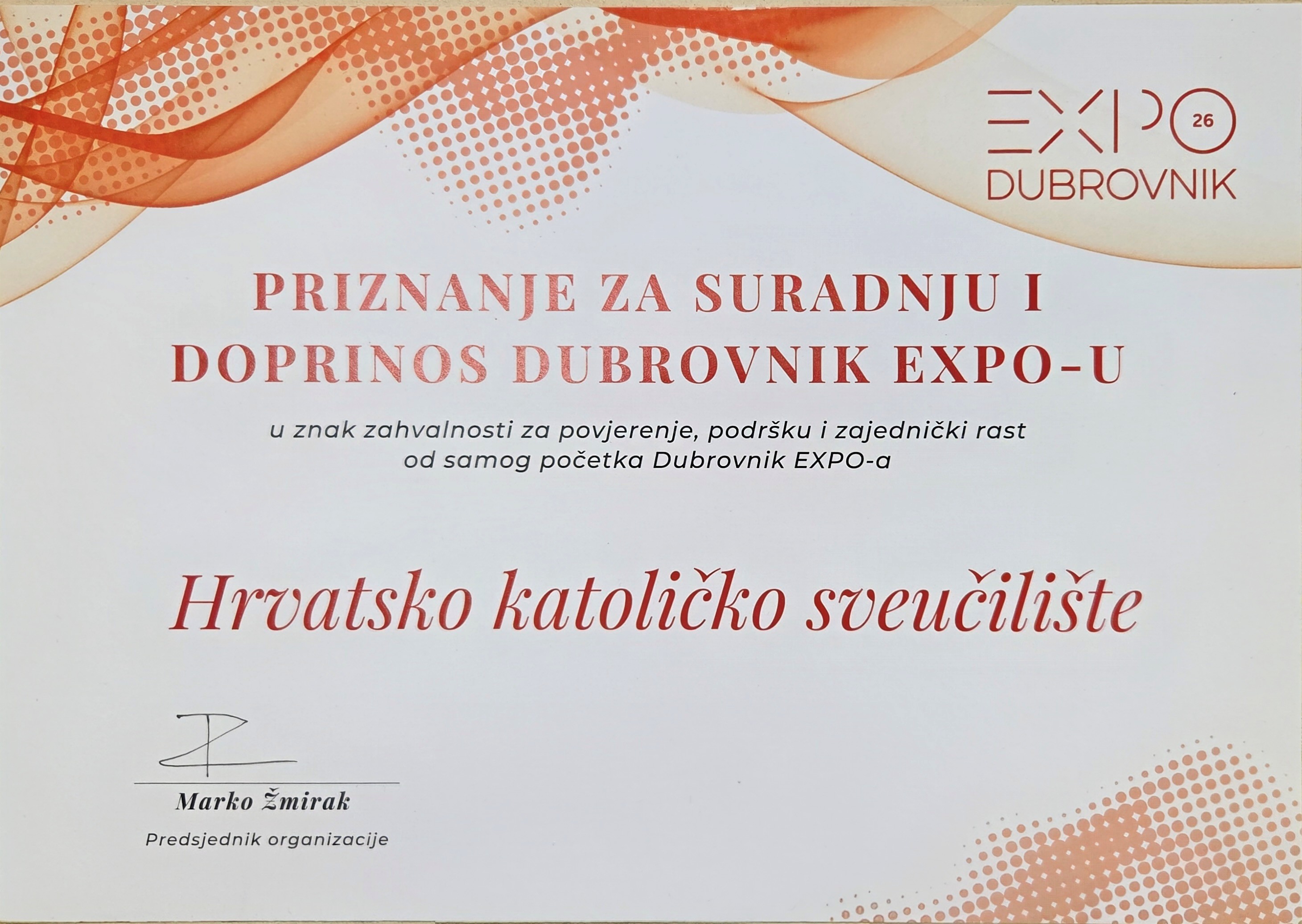 Alongside the EXPO, Nikola Budor and Assist. Prof. Vesna Mijoč, PhD, visited the Dubrovnik Private Gymnasium, where they presented the study programmes of the Catholic University of Croatia to graduating students. As one of the first universities to support Dubrovnik EXPO, the Catholic University of Croatia received a recognition for its cooperation and contribution, which was accepted on behalf of the academic community by Assist. Prof. Vesna Mijoč, PhD.