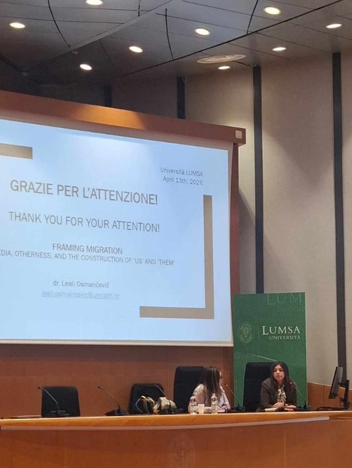 As part of the Erasmus+ teaching mobility programme, Leali Osmančević, PhD, from the University Department of Communication Studies at the Catholic University of Croatia, stayed at Libera Università Maria Santissima Assunta in Rome from 13 to 17 April 2026. She delivered guest lectures for students of social sciences and humanities titled “Framing Migration: Media, Otherness, and the Construction of ‘Us’ and ‘Them’” and “How Media Tells Stories of Migration: Qualitative Approaches to Media Analysis,” which also included a research practicum.