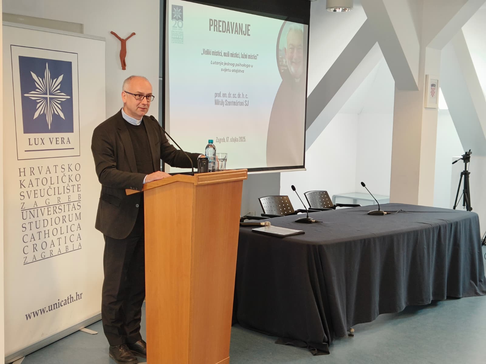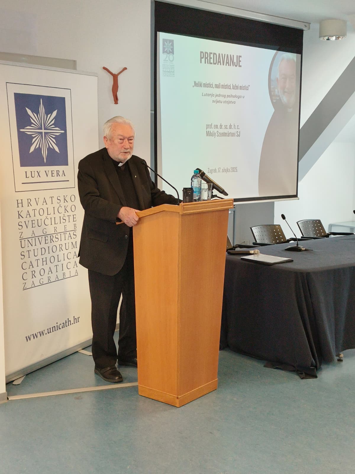 On Tuesday, 17 March 2026, a lecture by the distinguished Jesuit, psychologist, and university professor, Prof. Emer. Mihály Szentmártoni, PhD, Dr. h. c., SJ, titled “Great Mystics, Small Mystics, False Mystics – The Wanderings of a Psychologist in the World of Mysteries,” was held in the “Bl. Alojzije Card. Stepinac” Hall.