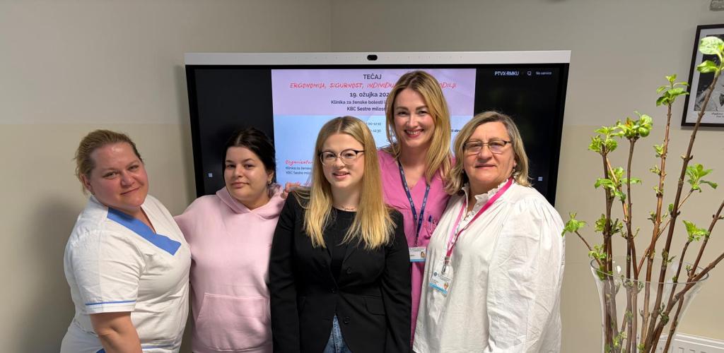 First-year undergraduate midwifery students Patricia Bogdanović, Karla Strugar, Ivana Grgić, and Ana Marija Grgić participated in a professional course titled “Ergonomics, Safety and an Individual Approach to the Woman in Labour,” organized by the Clinic for Gynecology and Obstetrics of the Sisters of Charity University Hospital Centre.