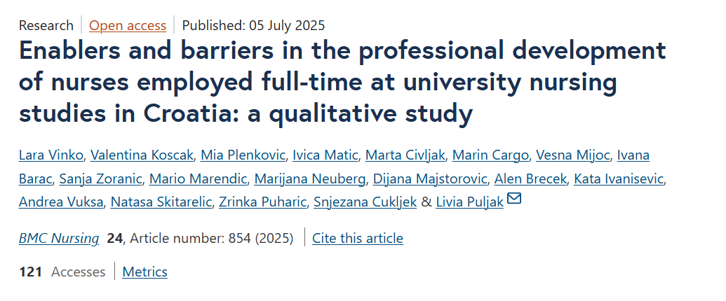 The research conducted by Lara Vinko, MSc in Nursing, as part of her graduate thesis at the Catholic University of Croatia, has been published in the scientific journal BMC Nursing (Impact Factor: 3.9). Her article, titled “Enablers and barriers in the professional development of nurses employed full-time at university nursing studies in Croatia: a qualitative study,” explores the professional development of university teaching staff in nursing—a topic previously unexplored in the Croatian academic context. The findings are based on a comprehensive qualitative study conducted in 2024 with 52 full-time nursing educators from 12 higher education institutions across Croatia.