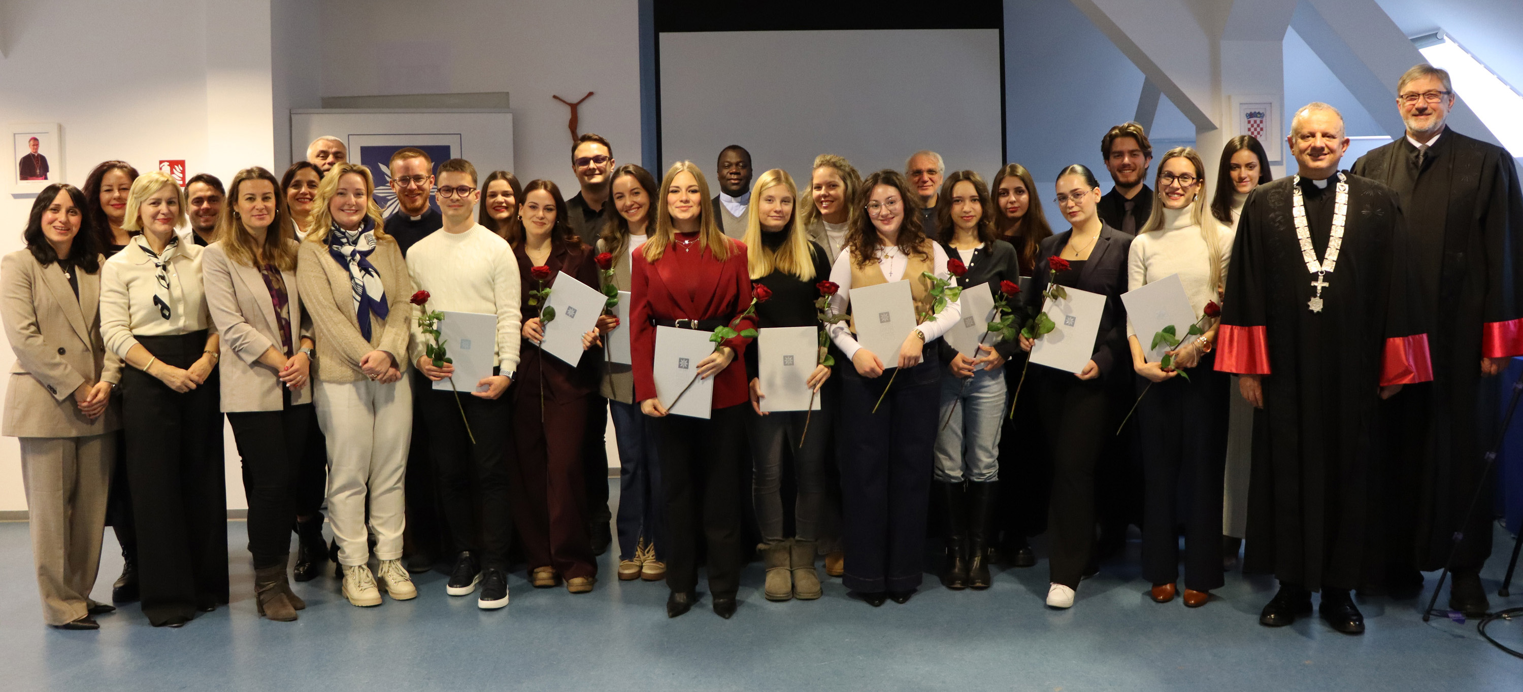 Alongside the scholarship recipients, the ceremonial event held in the “Blessed Alojzije Cardinal Stepinac” Hall was attended by the Rector of the Catholic University of Croatia (CUC), Prof. Željko Tanjić, PhD; the Vice-Rector for Science and Chair of the Scholarship Committee, Prof. Roberto Antolović, PhD; the Vice-Rector for International Cooperation, Prof. Jasna Ćurković Nimac, PhD; heads of the University departments; and the University chaplain, Branimir Jagodić.