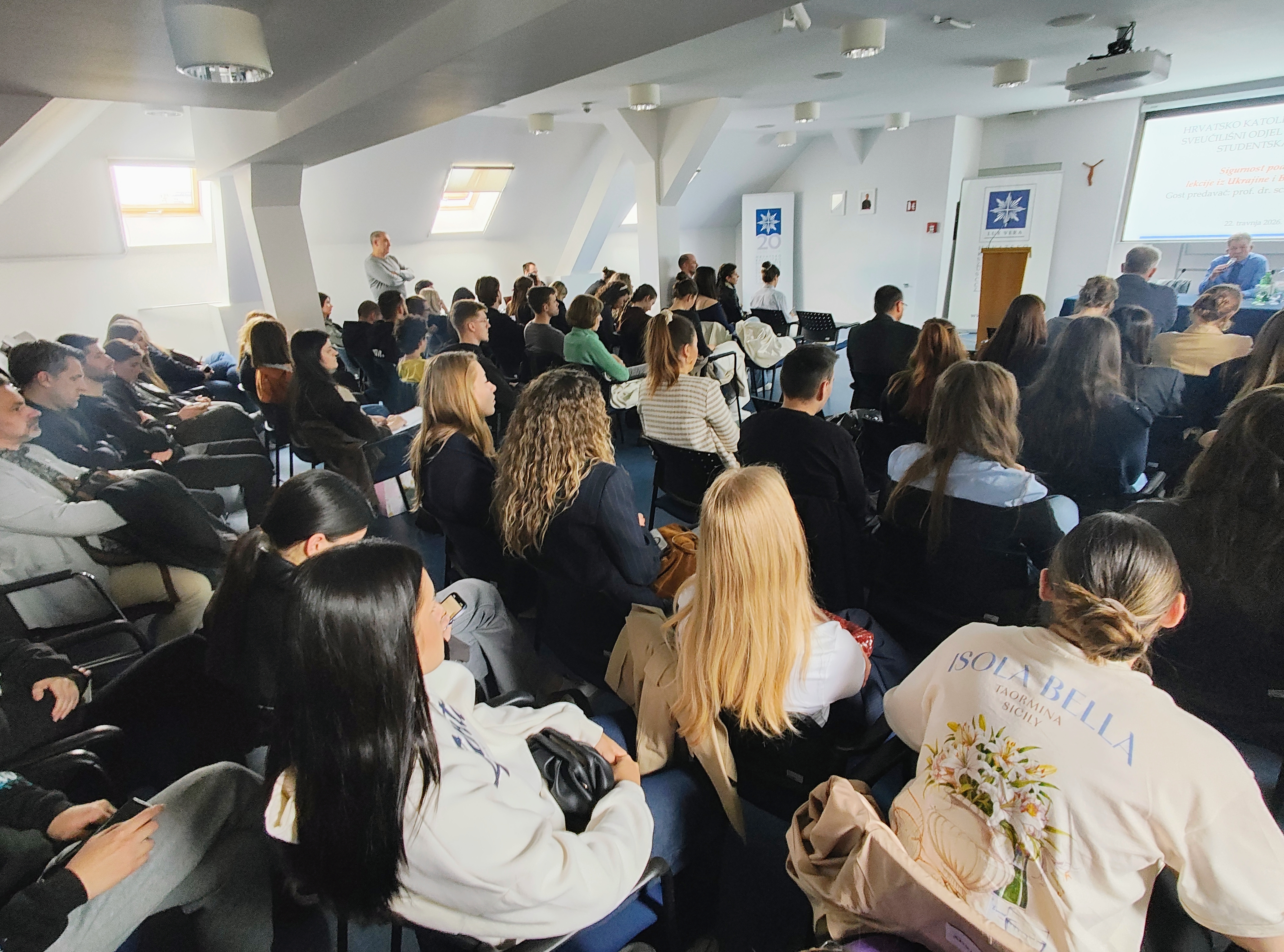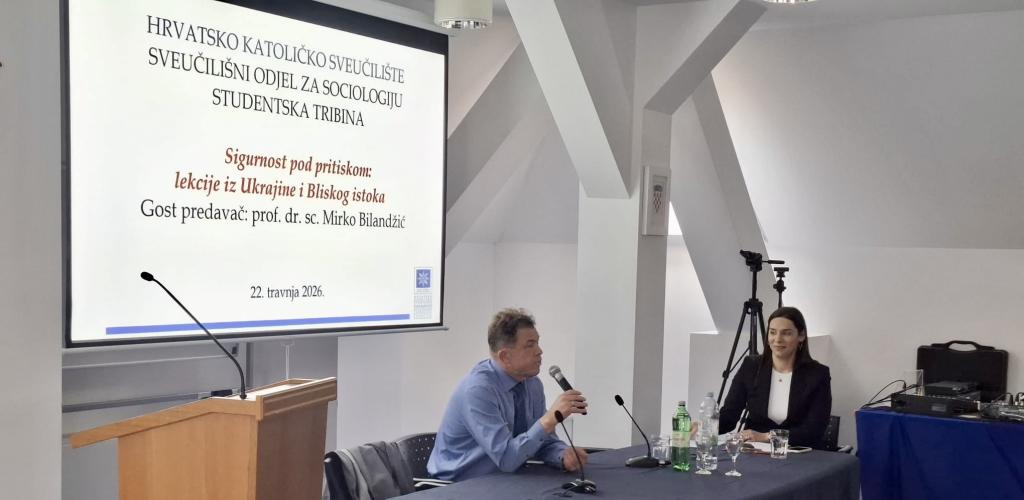 On Wednesday, April 22, 2026, the second student forum of the University Department of Sociology titled “Security Under Pressure: Lessons from Ukraine and the Middle East” was held in the “Blessed Alojzije Cardinal Stepinac” Hall. The guest lecturer was Prof. Dr. Mirko Bilandžić from the Department of Sociology, Faculty of Humanities and Social Sciences, University of Zagreb.