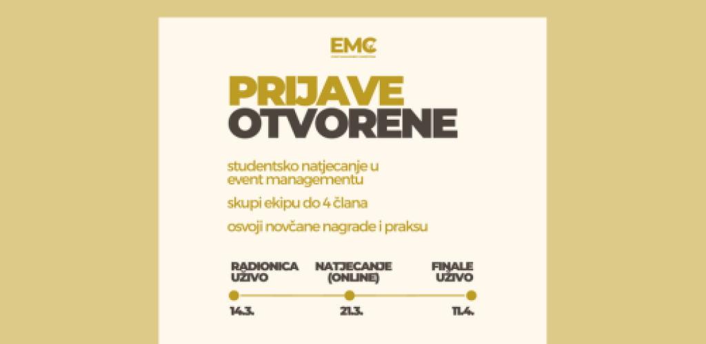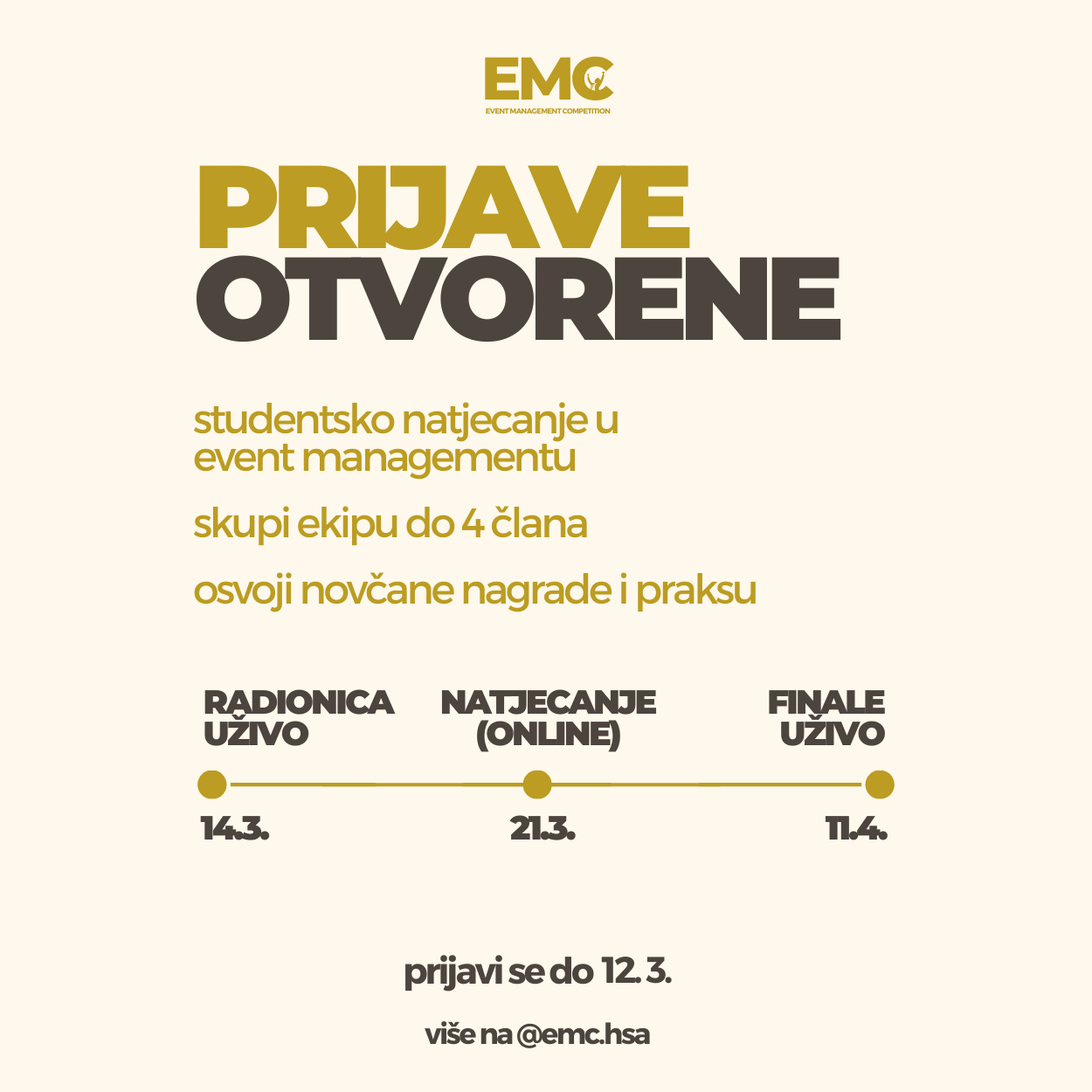 The Event Management Competition (EMC) is a unique project organised by the Croatian Student Association (HSA). During the competition, students have the opportunity to present their creative ideas and organisational skills, gain new knowledge in event management through an educational workshop, and collaborate with professionals from the event management industry.