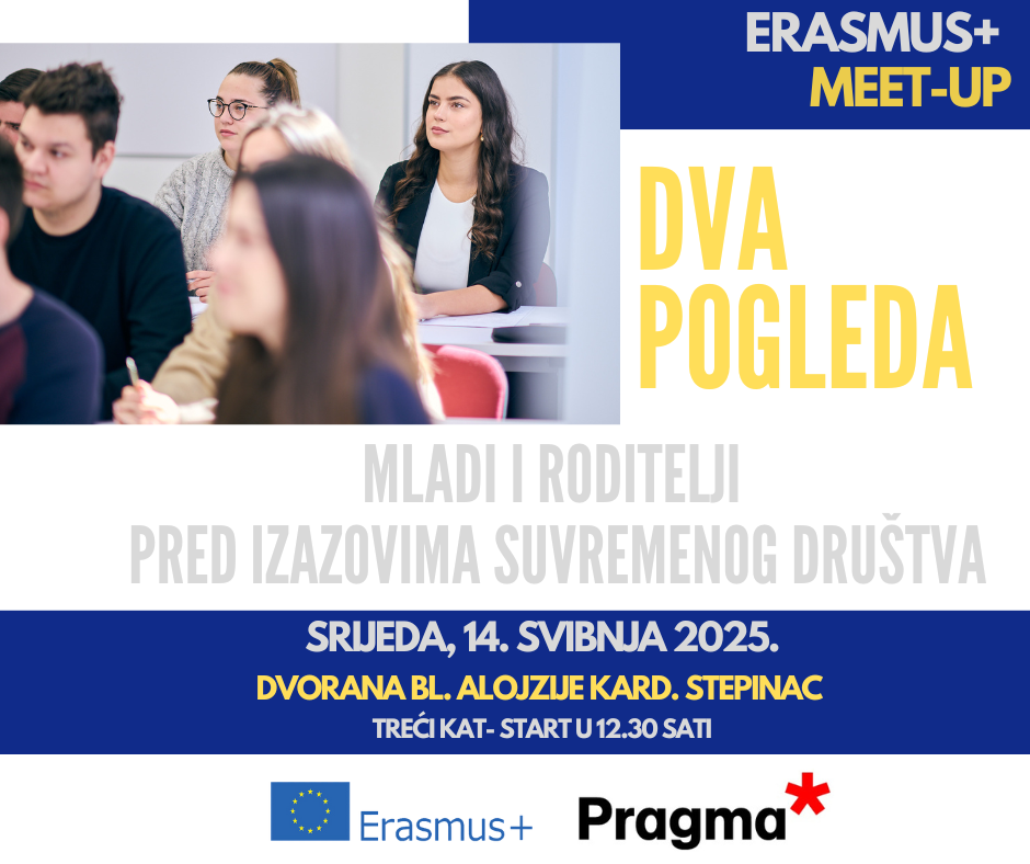 Pozivamo vas na Erasmus MeetUp koji će se održati u srijedu, 14. svibnja 2025. u 12:30 sati, u dvorani Blaženog kard. Alojzija Stepinca.