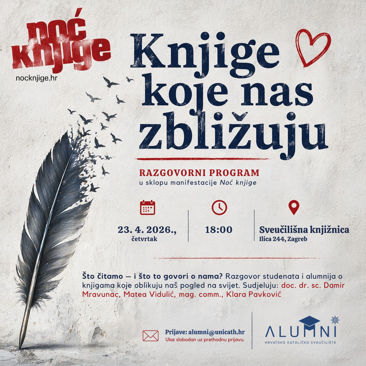 U sklopu nacionalne manifestacije Noć knjige, Udruga Alumni Hrvatskog katoličkog sveučilišta u suradnji sa Sveučilišnom knjižnicom organizira razgovorni program „Knjige koje nas zbližuju“, koji će se održati u četvrtak, 23. travnja 2026., u prostoru Sveučilišne knjižnice na Hrvatskome katoličkom sveučilištu u Zagrebu.