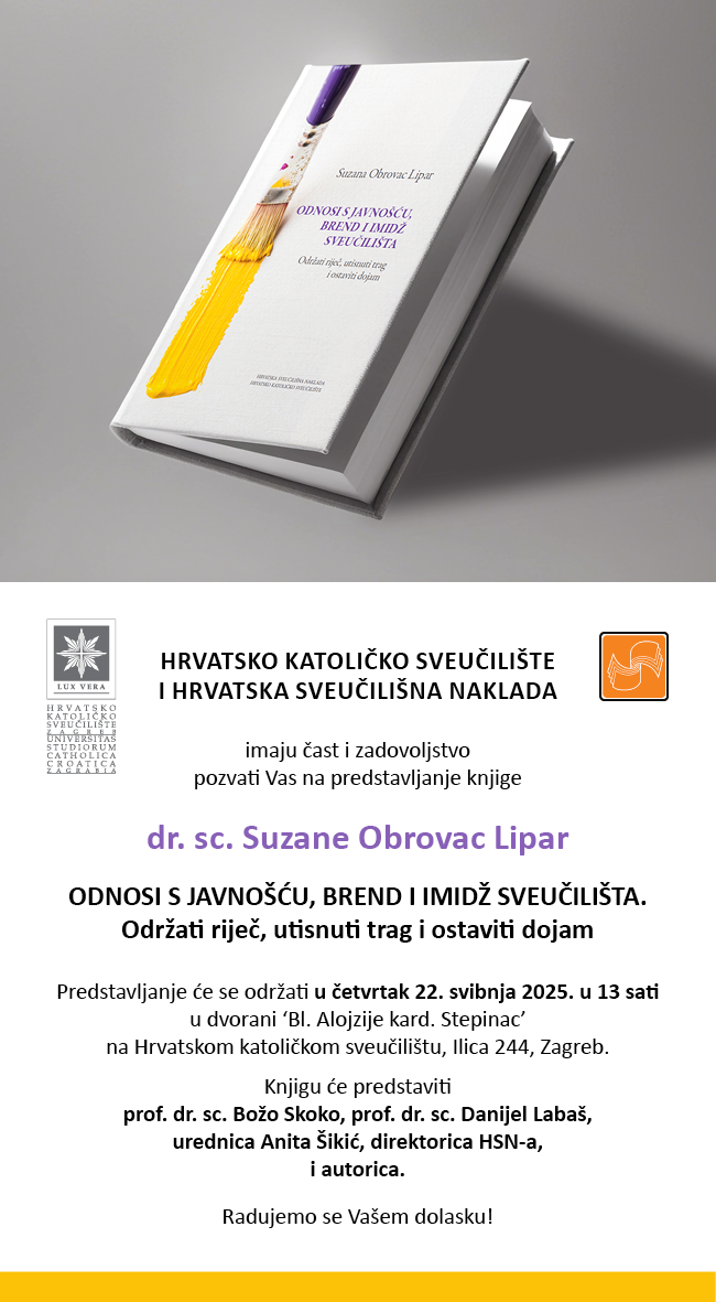 U četvrtak 22. svibnja 2025. u 13 sati u dvorani „Bl. Alojzije kard. Stepinac“ održat će se predstavljanje knjige „Odnosi s javnošću, brend i imdiž sveučilišta. Održati riječ, utisnuti trag i ostaviti dojam“ dr. sc. Suzane Obrovac Lipar.