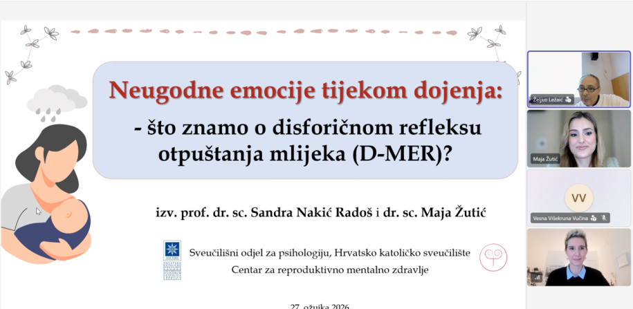 Nastavnice sa Sveučilišnog odjela za psihologiju, izv. prof. dr. sc. Sandra Nakić Radoš i dr. sc. Maja Žutić, u petak 27. ožujka 2026. održale su izlaganje na 10. Simpoziju o dojenju u organizaciji Hrvatske udruge grupa za potporu dojenju (HUGPD). Nakić Radoš i Žutić zajedno su održale predavanje na temu „Neugodne emocije tijekom dojenja: što znamo o disforičnom refleksu otpuštanja mlijeka (D-MER)?“ gdje su predstavile najnovije spoznaje o disforičnom refleksu otpuštanja mlijeka (D-…