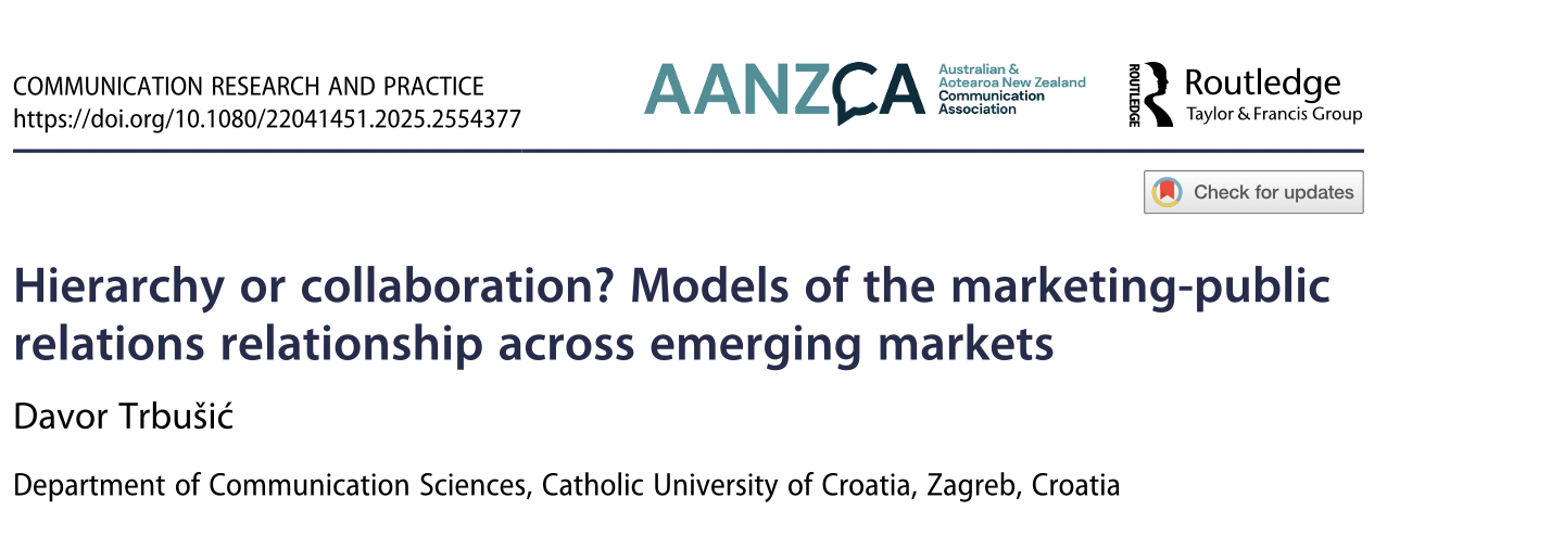 The paper, titled Hierarchy or collaboration? Models of the marketing-public relations relationship across emerging markets, analyzes organizational models of the relationship between marketing and public relations in large companies from transitional economies, using Croatian firms as an illustrative sample.