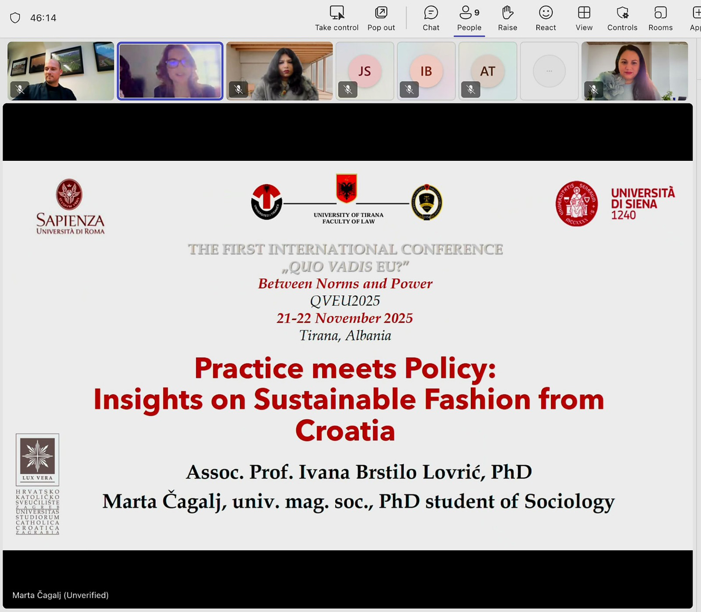 Assoc. Prof. Ivana Brstilo Lovrić, Ph.D., Head of the Department of Sociology, together with Marta Čagalj, doctoral student in the PhD programme Sociology: Values, Identity and Social Change in Croatian Society, delivered a presentation entitled Practice Meets Policy: Insights on Sustainable Fashion in Croatia. Their presentation offered a critical analysis of the contemporary fashion industry at the global, national, and European levels from the perspective of young consumers, fashion designers, and EU public policies, with a particular focus on sustainability and cultural change.