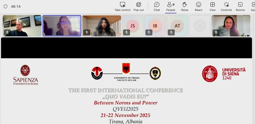 From Friday to Saturday, 21–22 November 2025, the first international scientific conference Quo Vadis, EU? Between Norms and Power was held, jointly organised by Sapienza University of Rome, the University of Siena, and the University of Tirana. The conference brought together numerous international scholars and experts who discussed, from an interdisciplinary perspective, current topics related to the normative framework and future development of the European Union.