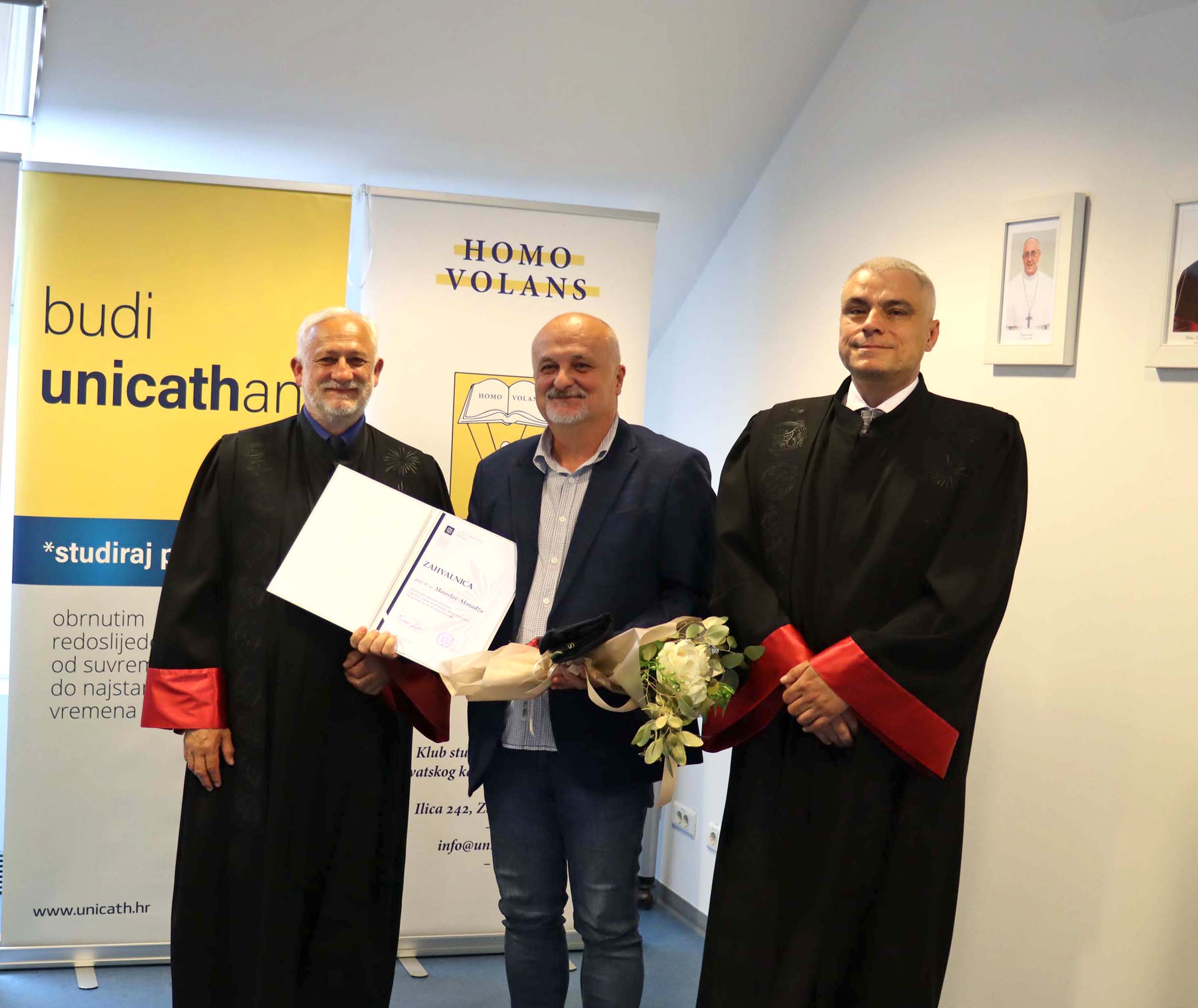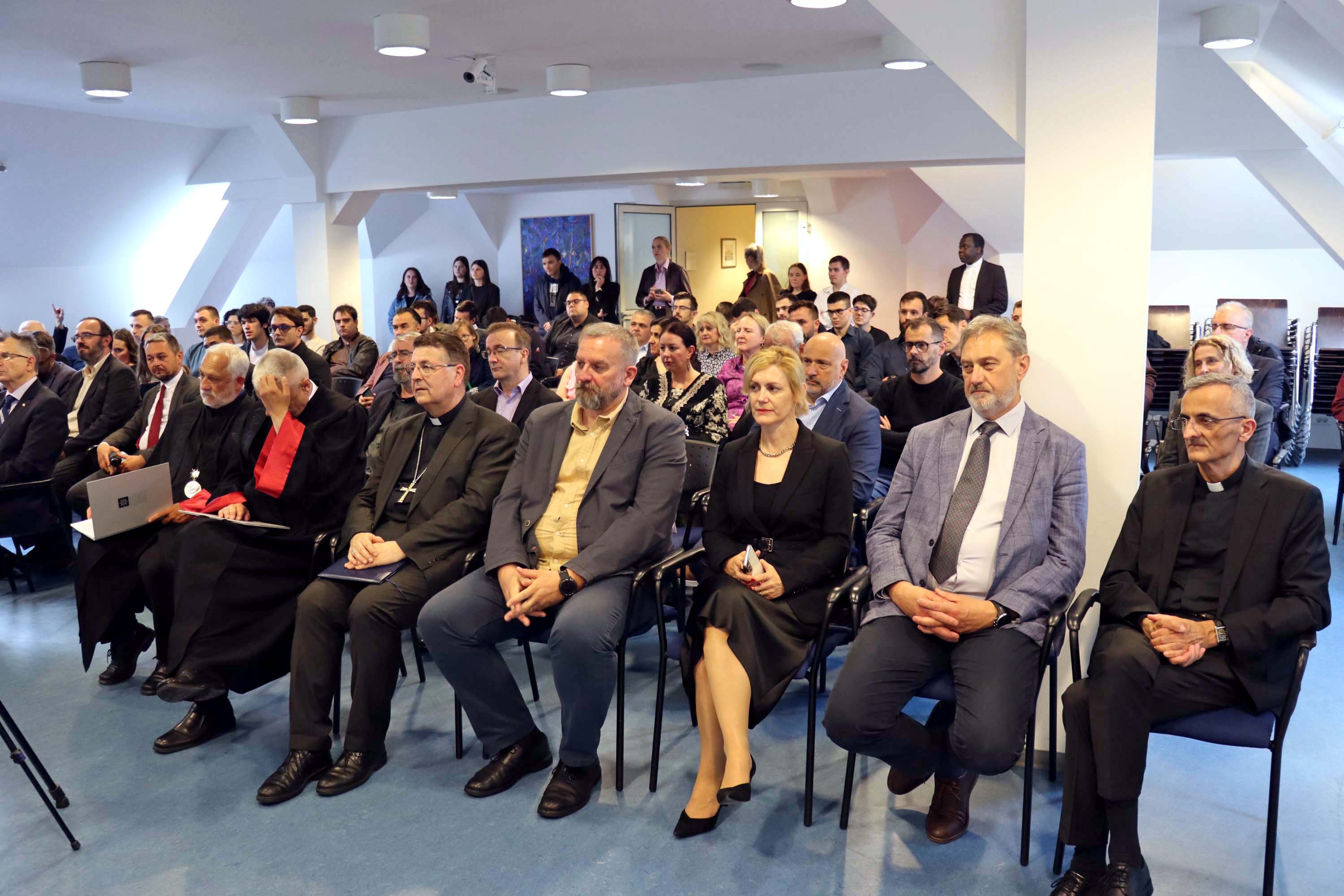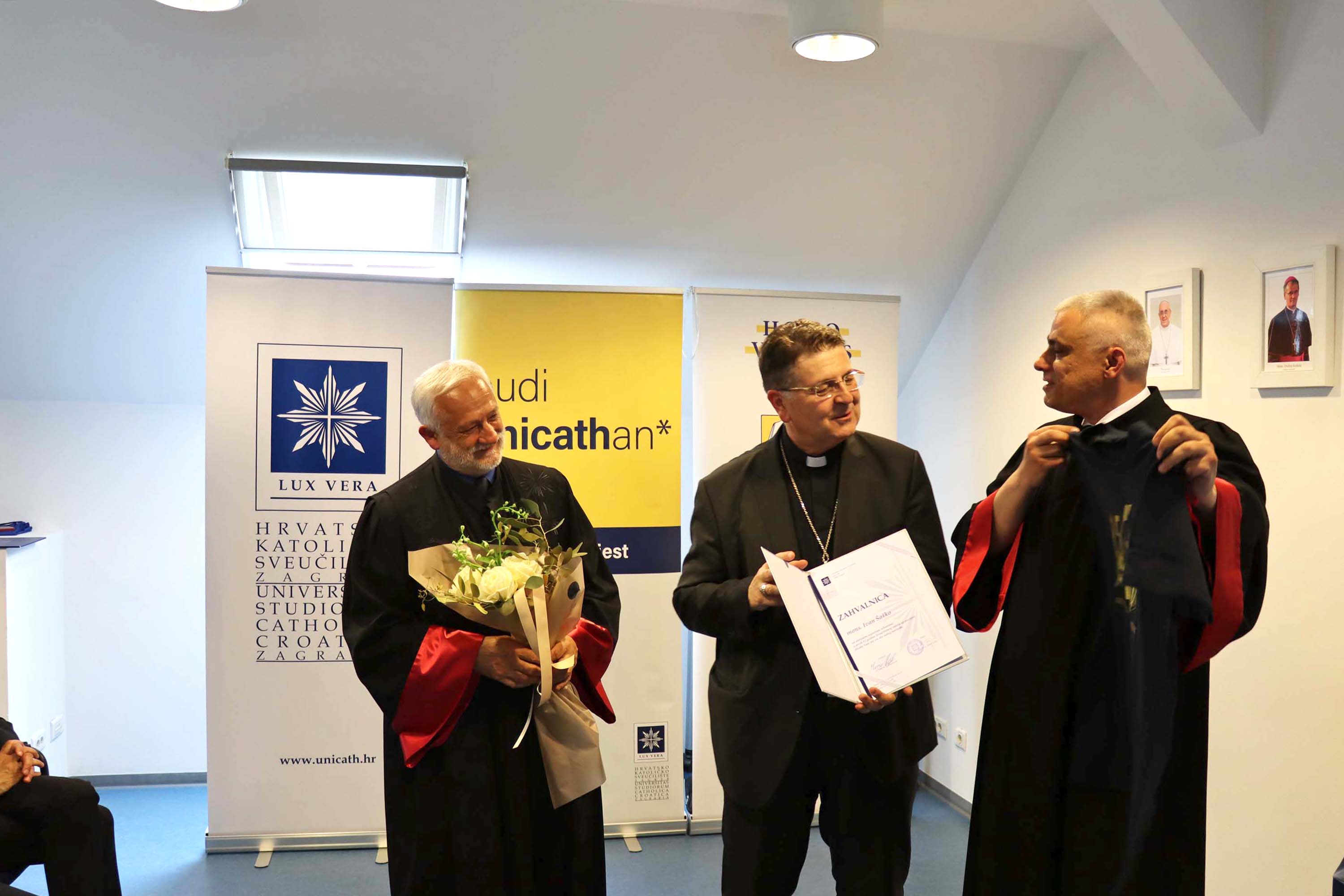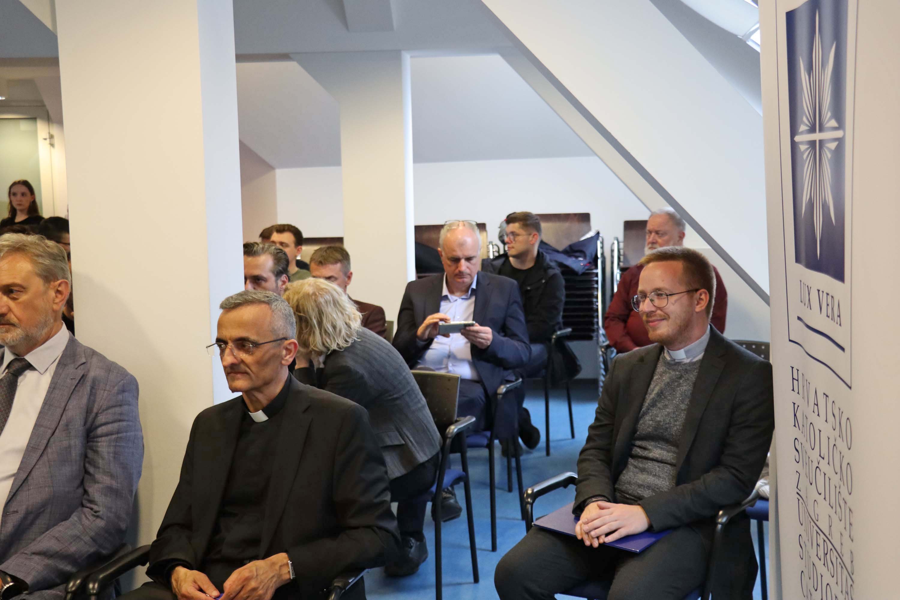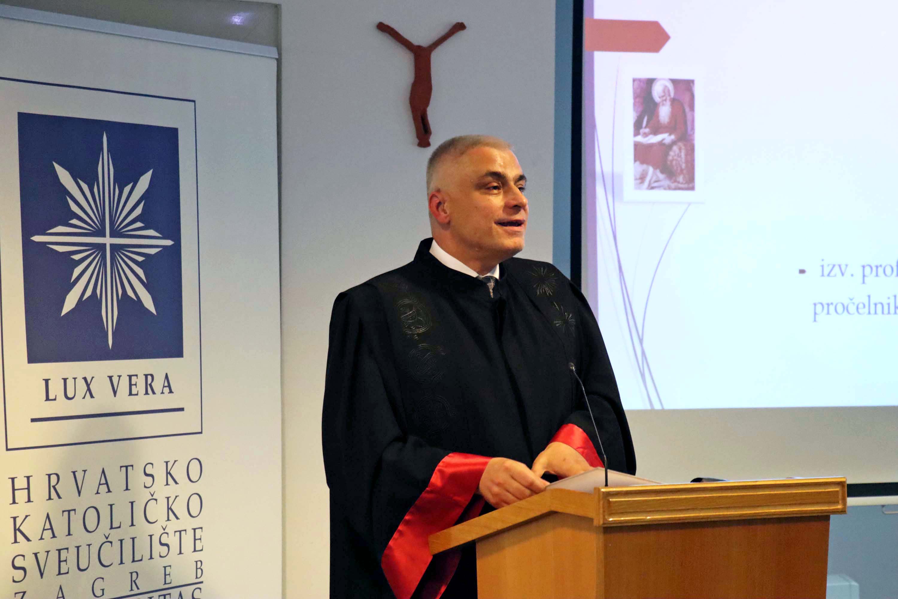 The formal academic ceremony, moderated by Veronika Novoselac, assistant at the University Department of History, continued in the “Blessed Alojzije Cardinal Stepinac” hall. Following the Croatian national anthem, welcome speeches were delivered by Mons. Šaško, Vice-Rector for Organization and Business Affairs Prof. Gordan Črpić, and the Head of the University Department of History, Assoc. Prof. Mario Kevo. In addition to vice-rectors, department heads and deputy heads, many students and faculty members, the celebration was also attended by: Prof. Dr. h. c. Emilio Marin, the first professor emeritus of the Catholic University of Croatia and a member of the Pontifical Committee for Historical Sciences as well as the Scientific Council of the Holy See for the Evaluation and Promotion of the Quality of Ecclesiastical University Studies; Prof. Mario Cifrak, Dean of the Catholic Faculty of Theology, University of Zagreb; Assoc. Prof. Tomislav Krstičević, Acting Dean of the Faculty of Croatian Studies, University of Zagreb; Assoc. Prof. Denis Barić, Head of the Institute of Religious Sciences of the Catholic Faculty of Theology, University of Zagreb and prebendary of the Zagreb Cathedral Chapter; Prof. Miroslav Akmadža, Director of the Croatian Institute of History in Zagreb; Assoc. Prof. Josip Mihaljević, Deputy Director of the Croatian Institute of History in Zagreb; Assoc. Prof. Gordan Ravančić, Deputy Director of the Croatian Institute of History in Zagreb; Dr. Ljiljana Dobrovšak, Deputy Director of the Institute of Social Sciences "Ivo Pilar" in Zagreb; Prof. Ivica Šute, Head of the Department of History at the Faculty of Humanities and Social Sciences, University of Zagreb; Prof. Ante Nazor, Director of the Croatian Memorial-Documentation Center of the Homeland War; and other distinguished guests.