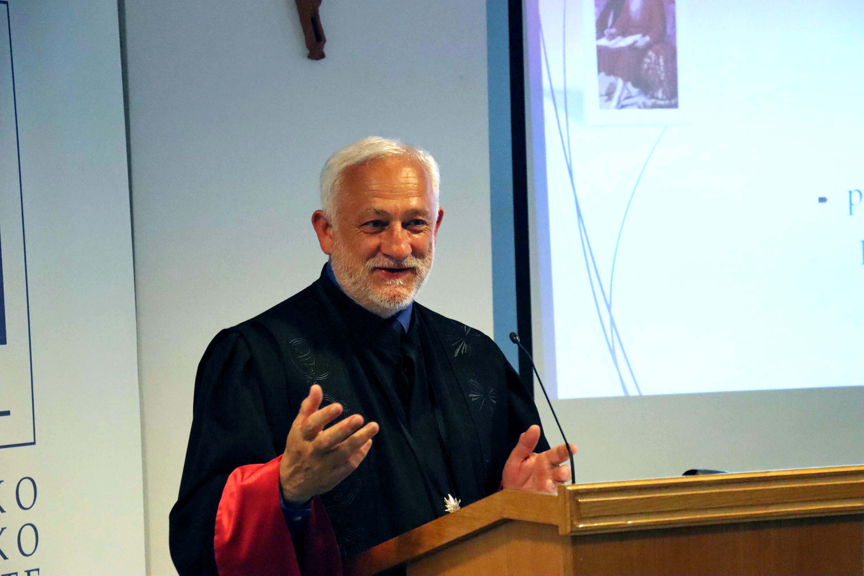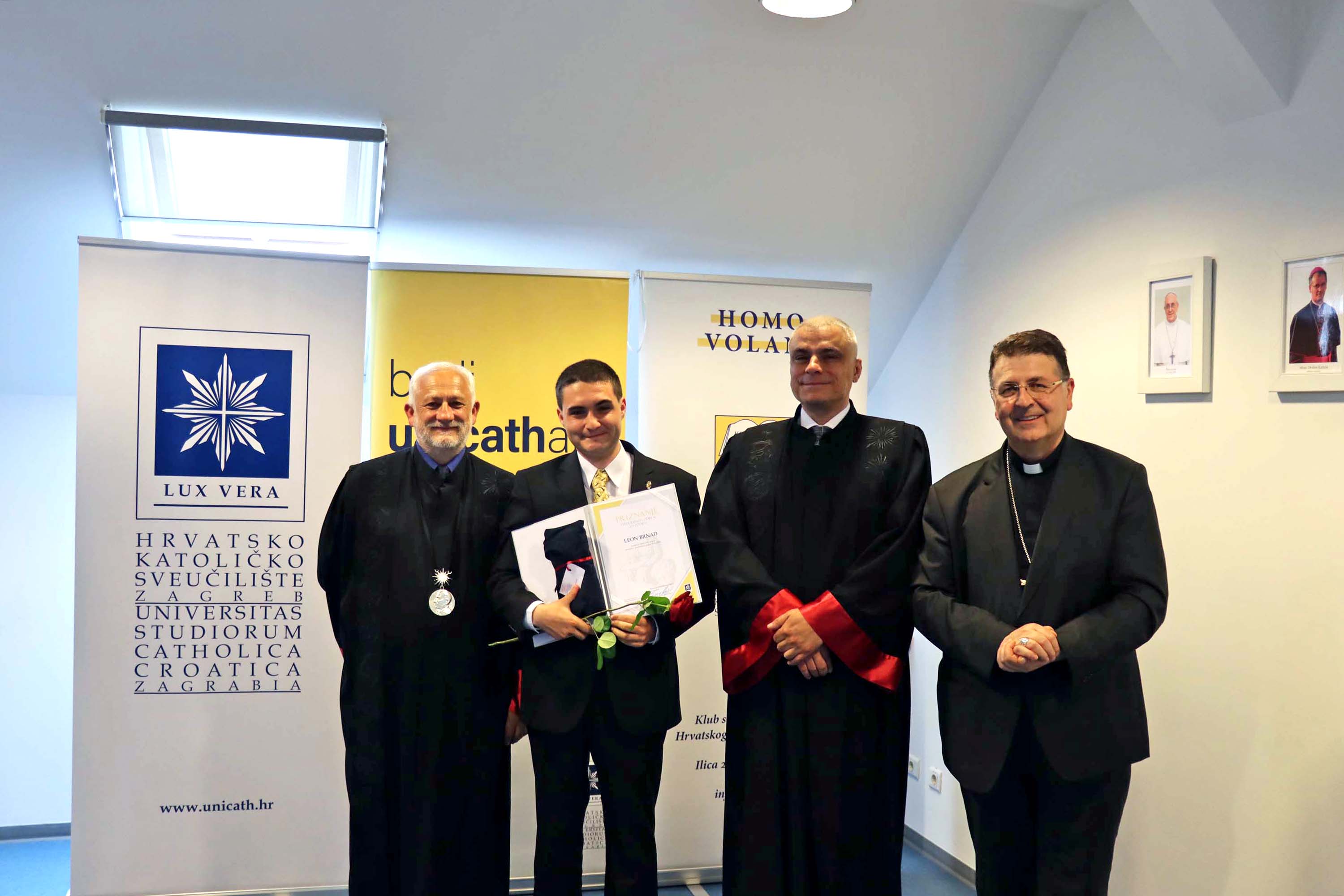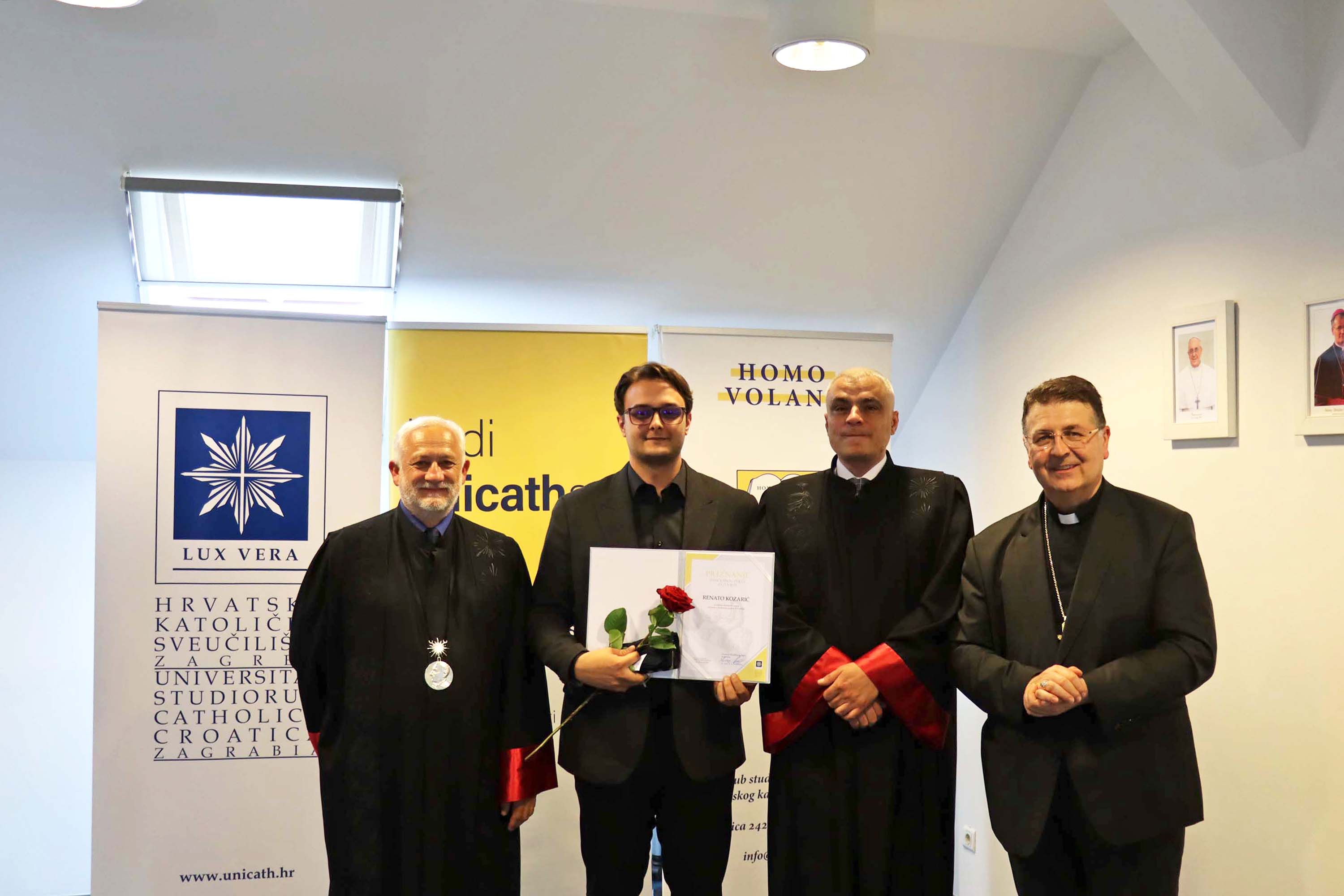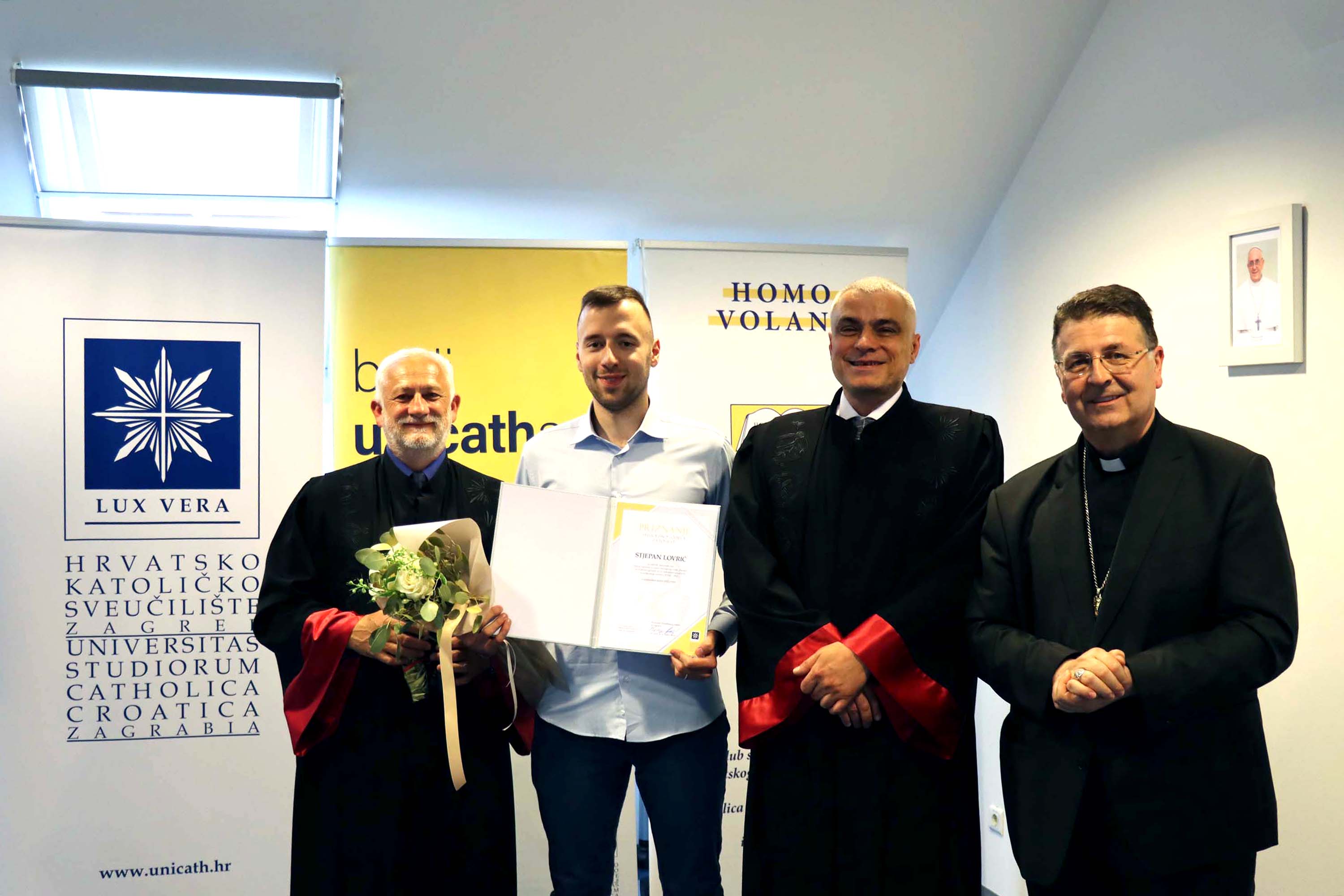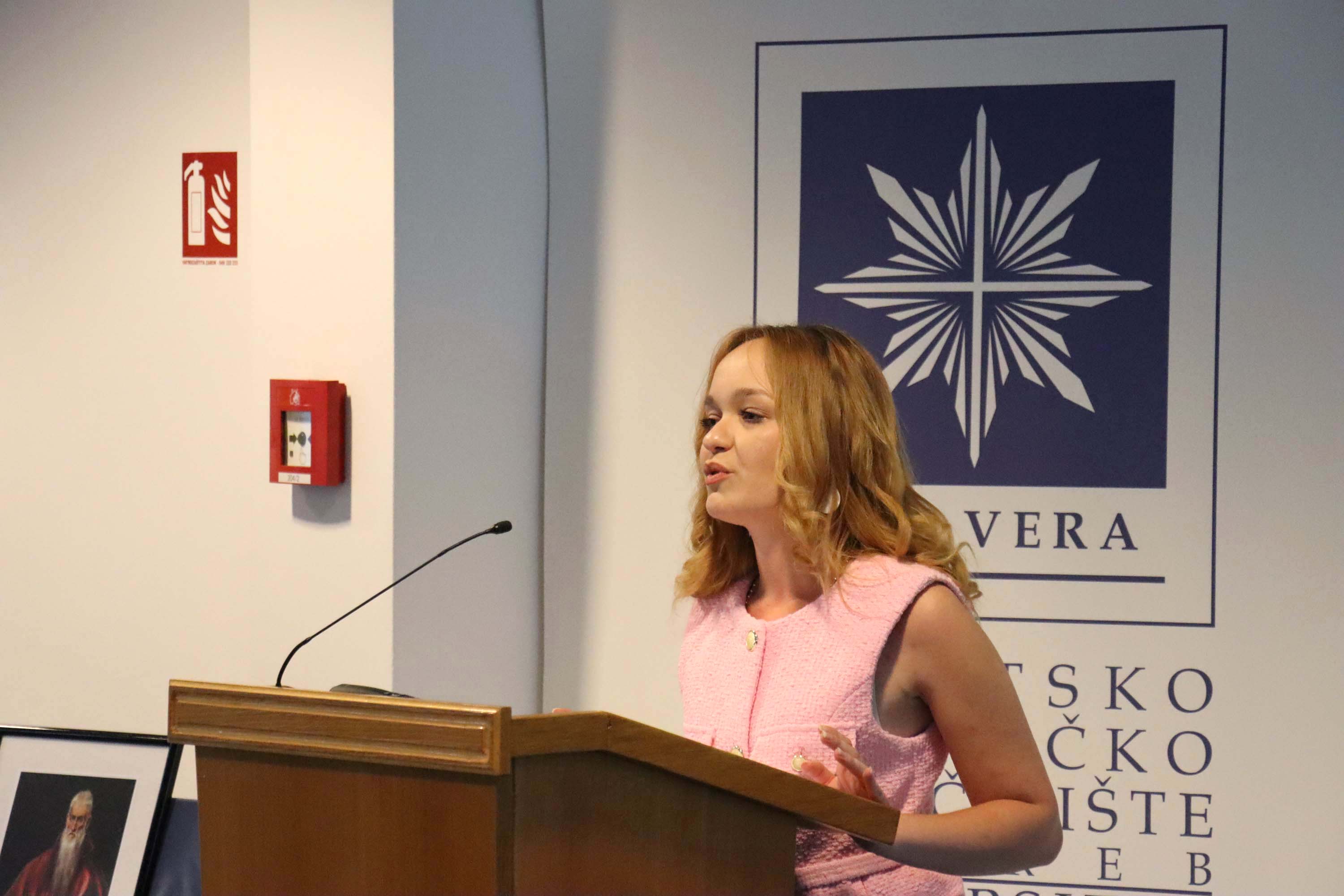 The formal academic ceremony, moderated by Veronika Novoselac, assistant at the University Department of History, continued in the “Blessed Alojzije Cardinal Stepinac” hall. Following the Croatian national anthem, welcome speeches were delivered by Mons. Šaško, Vice-Rector for Organization and Business Affairs Prof. Gordan Črpić, and the Head of the University Department of History, Assoc. Prof. Mario Kevo. In addition to vice-rectors, department heads and deputy heads, many students and faculty members, the celebration was also attended by: Prof. Dr. h. c. Emilio Marin, the first professor emeritus of the Catholic University of Croatia and a member of the Pontifical Committee for Historical Sciences as well as the Scientific Council of the Holy See for the Evaluation and Promotion of the Quality of Ecclesiastical University Studies; Prof. Mario Cifrak, Dean of the Catholic Faculty of Theology, University of Zagreb; Assoc. Prof. Tomislav Krstičević, Acting Dean of the Faculty of Croatian Studies, University of Zagreb; Assoc. Prof. Denis Barić, Head of the Institute of Religious Sciences of the Catholic Faculty of Theology, University of Zagreb and prebendary of the Zagreb Cathedral Chapter; Prof. Miroslav Akmadža, Director of the Croatian Institute of History in Zagreb; Assoc. Prof. Josip Mihaljević, Deputy Director of the Croatian Institute of History in Zagreb; Assoc. Prof. Gordan Ravančić, Deputy Director of the Croatian Institute of History in Zagreb; Dr. Ljiljana Dobrovšak, Deputy Director of the Institute of Social Sciences "Ivo Pilar" in Zagreb; Prof. Ivica Šute, Head of the Department of History at the Faculty of Humanities and Social Sciences, University of Zagreb; Prof. Ante Nazor, Director of the Croatian Memorial-Documentation Center of the Homeland War; and other distinguished guests.