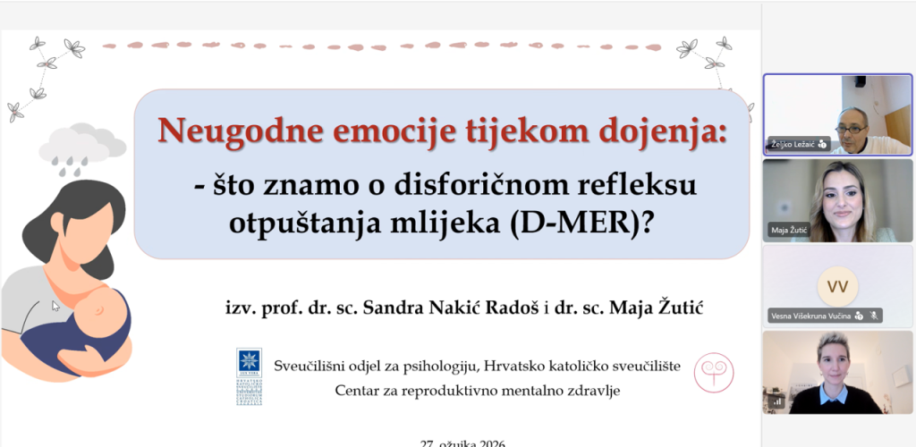 Nakić Radoš and Žutić jointly presented a lecture titled “Negative Emotions During Breastfeeding: What Do We Know About Dysphoric Milk Ejection Reflex (D-MER)?” in which they introduced the latest findings on this under-researched yet clinically significant phenomenon, characterized by a sudden wave of intense negative emotions during milk let-down in mothers. In addition to the theoretical overview, they presented the results of a pioneering study on this phenomenon conducted as part of the research project funded by the Catholic University of Croatia: “Determinants, Outcomes, and the Interrelationship of Mental and Physical Health of Women During Pregnancy and After Childbirth (MumHealth).”