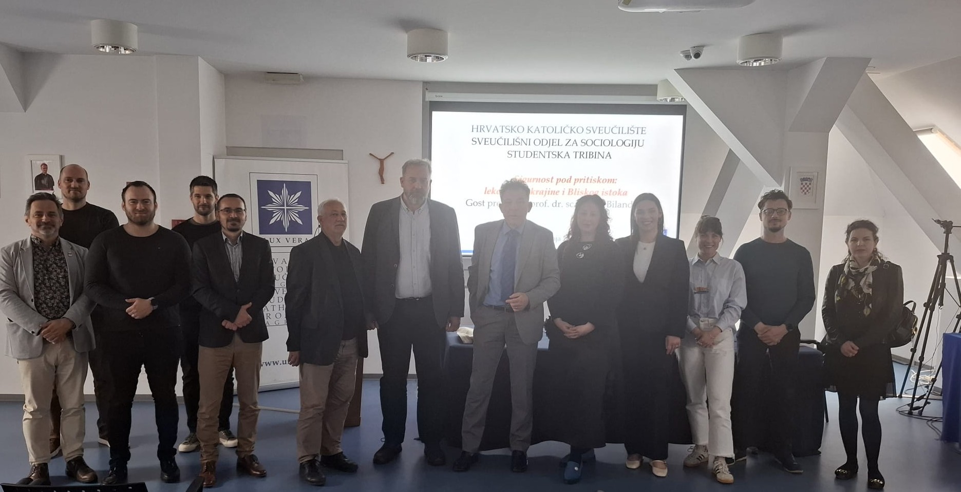 On Wednesday, April 22, 2026, the second student forum of the University Department of Sociology titled “Security Under Pressure: Lessons from Ukraine and the Middle East” was held in the “Blessed Alojzije Cardinal Stepinac” Hall. The guest lecturer was Prof. Dr. Mirko Bilandžić from the Department of Sociology, Faculty of Humanities and Social Sciences, University of Zagreb.