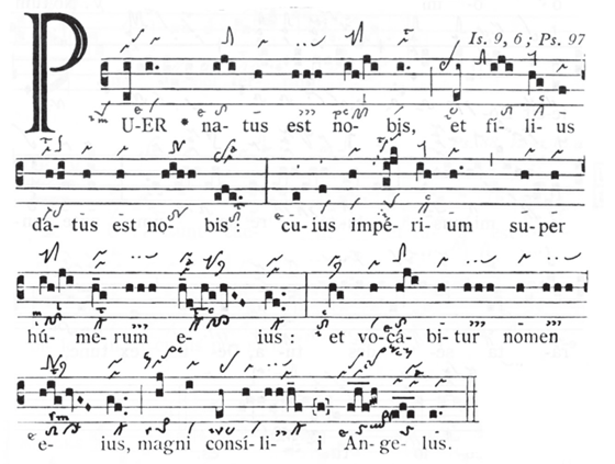 U gregorijanskom repertoaru ulazna pjesma za svetkovinu Božića bila je Puer natus est nobis. Tekst napjeva je preuzet iz knjige proroka Izaije (Iz 9,5). U prijevodu glasi: