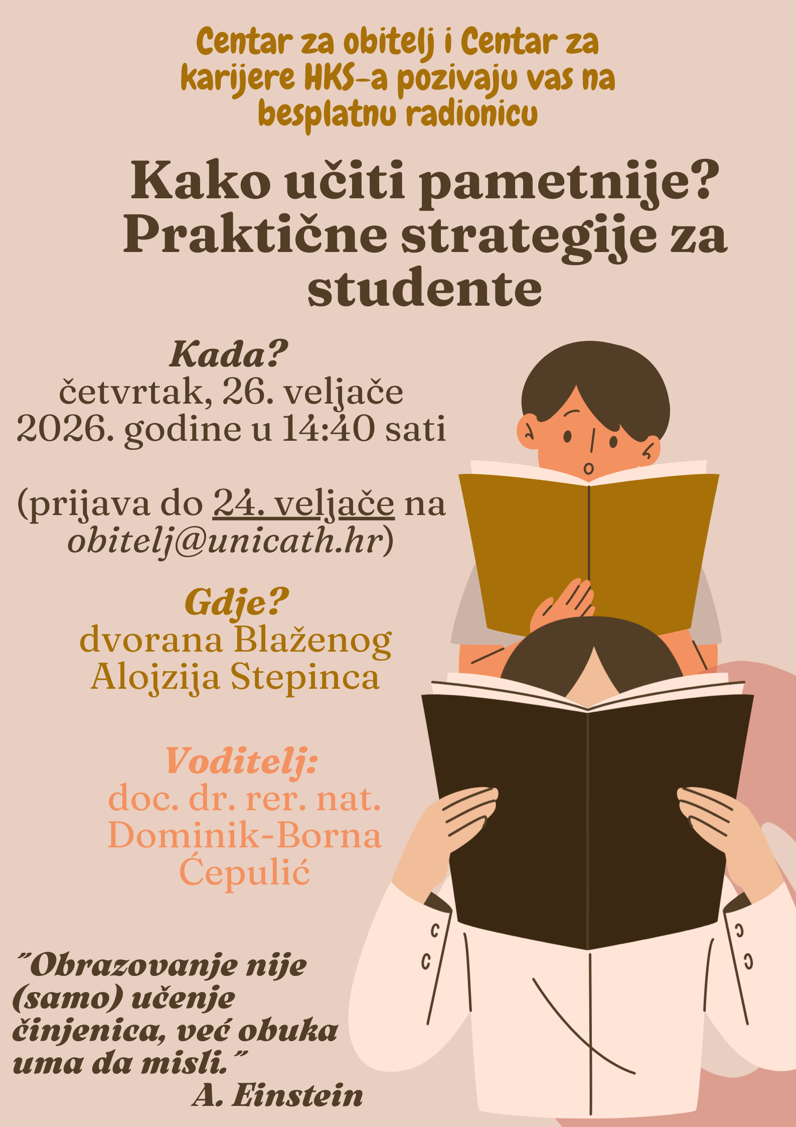 Nakon iskustva zimskih ispitnih rokova, početak ljetnog semestra pravi je trenutak da razmislite kako Vaše učenje može biti još zabavnije i efikasnije! Stoga Vas pozivamo na radionicu na kojoj ćete imati prilike naučiti više o tome kako funkcionira naše pamćenje, kako tome prilagoditi različite metode učenja, kako održati motivaciju za učenje, kako još bolje organizirati svoje vrijeme i još mnogo toga. Planirano trajanje radionice je oko 2 sata, a svoju prijavu, molimo, pošaljite na obitelj@unicath.hr najkasnije do 24. veljače. Veselimo se radu i učenju s Vama!