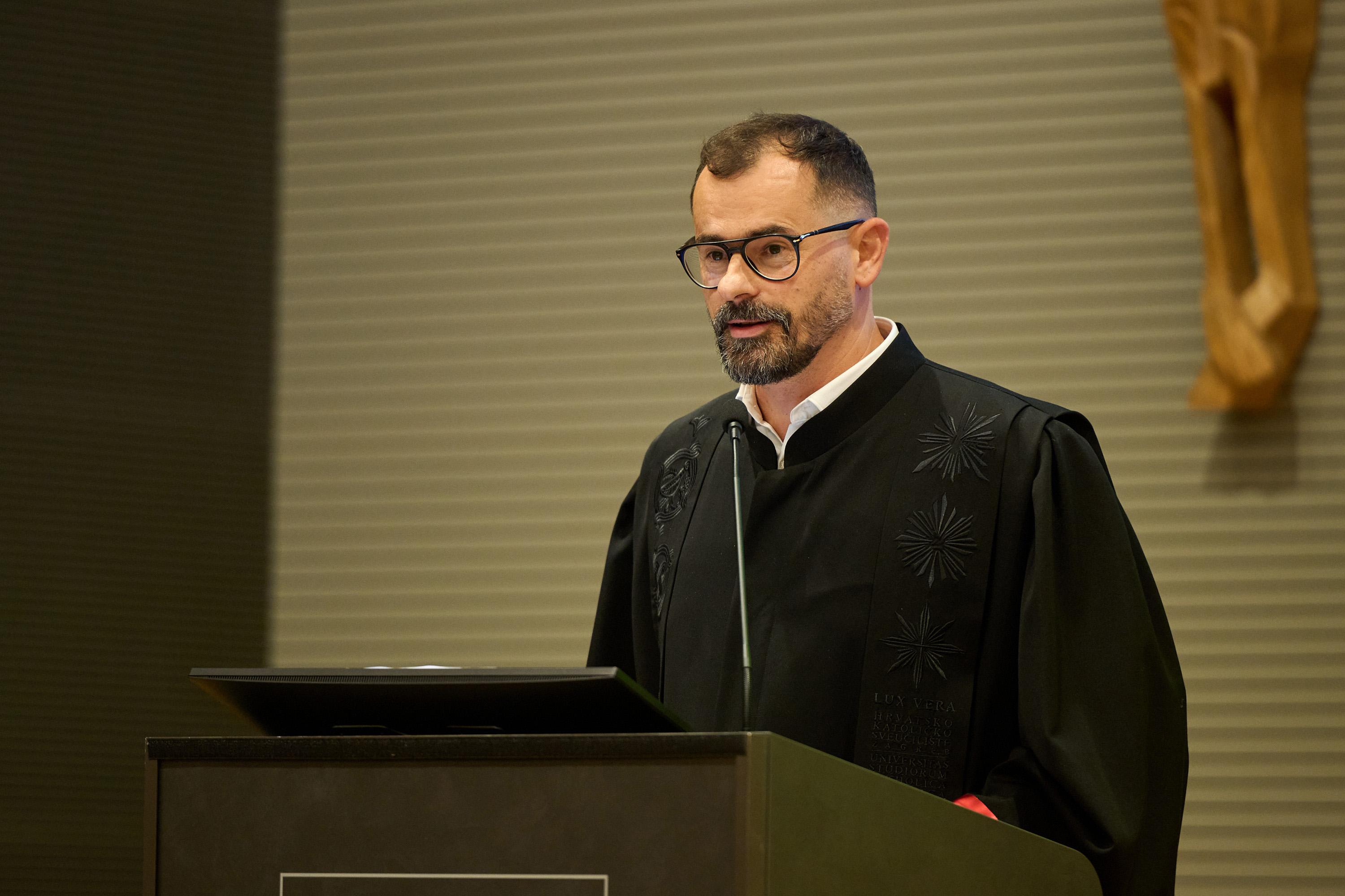 Okupljenima se obratio i v.d. dekana Fakulteta zdravstvenih studija doc. dr. sc. Ivica Matić koji je naglasio: "Želim svima vama zahvaliti što ste svoje obrazovanje i razvoj povjerili nama. Znam da to nije lako – pokloniti povjerenje uvijek je poseban izazov. Možda bi negdje drugdje bilo jednostavnije. Ali vi ste krenuli putem zajedništva, osobnog susreta i stvarne prisutnosti. Umjesto udaljenosti, izabrali ste blizinu; to je put koji ne stvara samo diplomu, nego oblikuje osobu... Čuli smo kratke priče o deset godina našega puta. Deset godina rasta, truda i zajedništva. Zahvaljujući velikom zalaganju uprave, službi sveučilišta, prve pročelnice profesorice Čivljak, naših studenata, nastavnika, te suradnika iz brojnih ustanova, kojima danas iskazujemo posebnu zahvalnost, – izgradili smo nešto trajno. Iz jednog odjela izrasli su novi studijski programi, novi prvostupnici i magistri, novi profesori. Ove akademske godine taj odjel prerasta u Fakultet zdravstvenih studija. To nije samo promjena imena, nego otvaranje jednog novog poglavlja. Fakultet je važan ne samo za sestrinstvo i primaljstvo, nego i za cijelo Sveučilište. On okuplja dvije profesije koje imaju zajedničko poslanje kao i Crkva– brigu za život, od njegova početka do kraja. Kad pogledamo unatrag, svaka ova godina sestrinstva na HKS-u obilježena je rastom. . Osnutak Fakulteta zdravstvenih studija kruna je tog desetogodišnjeg puta. Hvala svima koji su dio ovog puta – studentima, nastavnicima, suradnicima, našim partnerima u zdravstvu i naravno, upravi Sveučilišta na potpori i svim službama Sveučilišta", zaključio je doc. Matić.