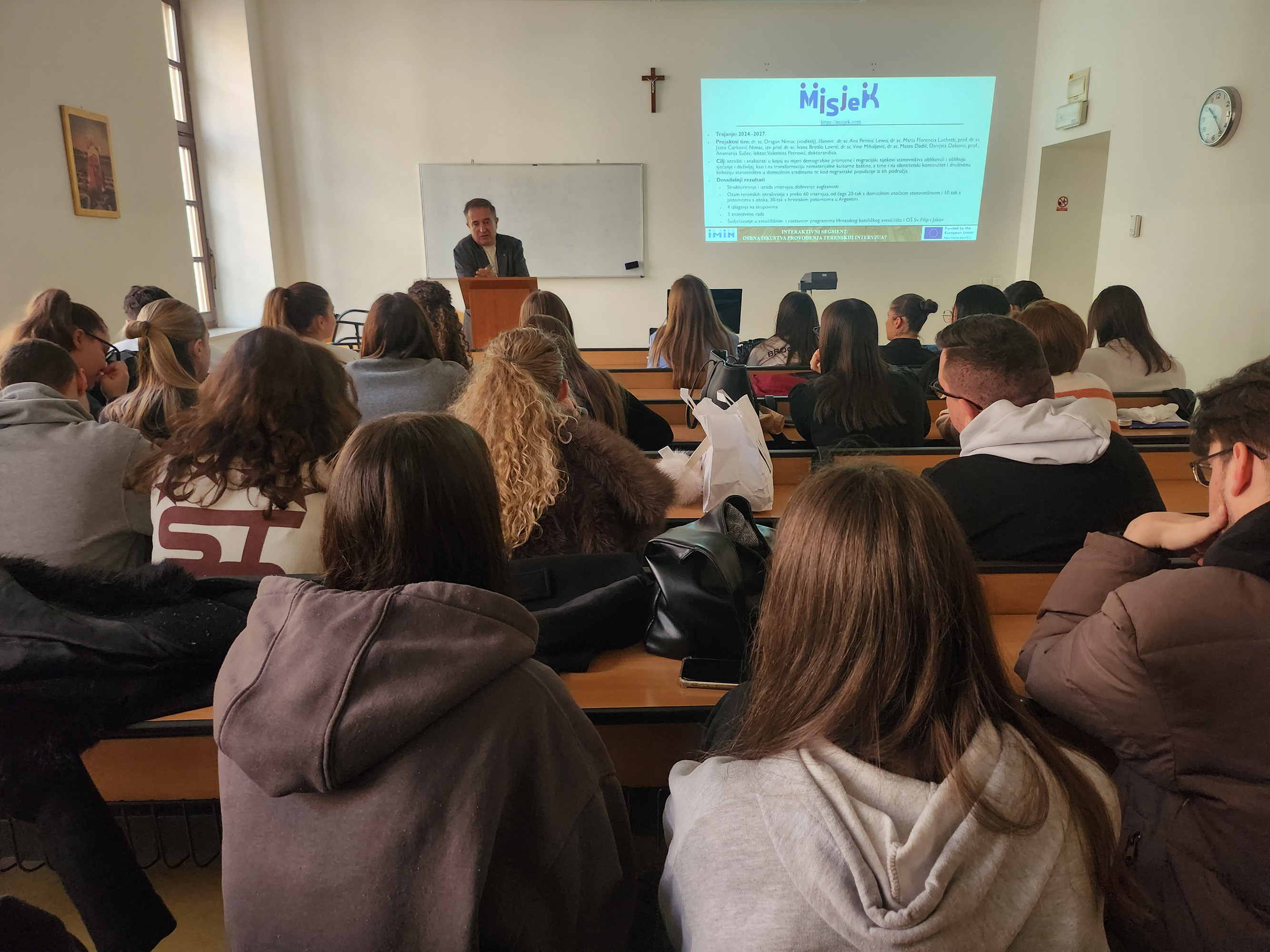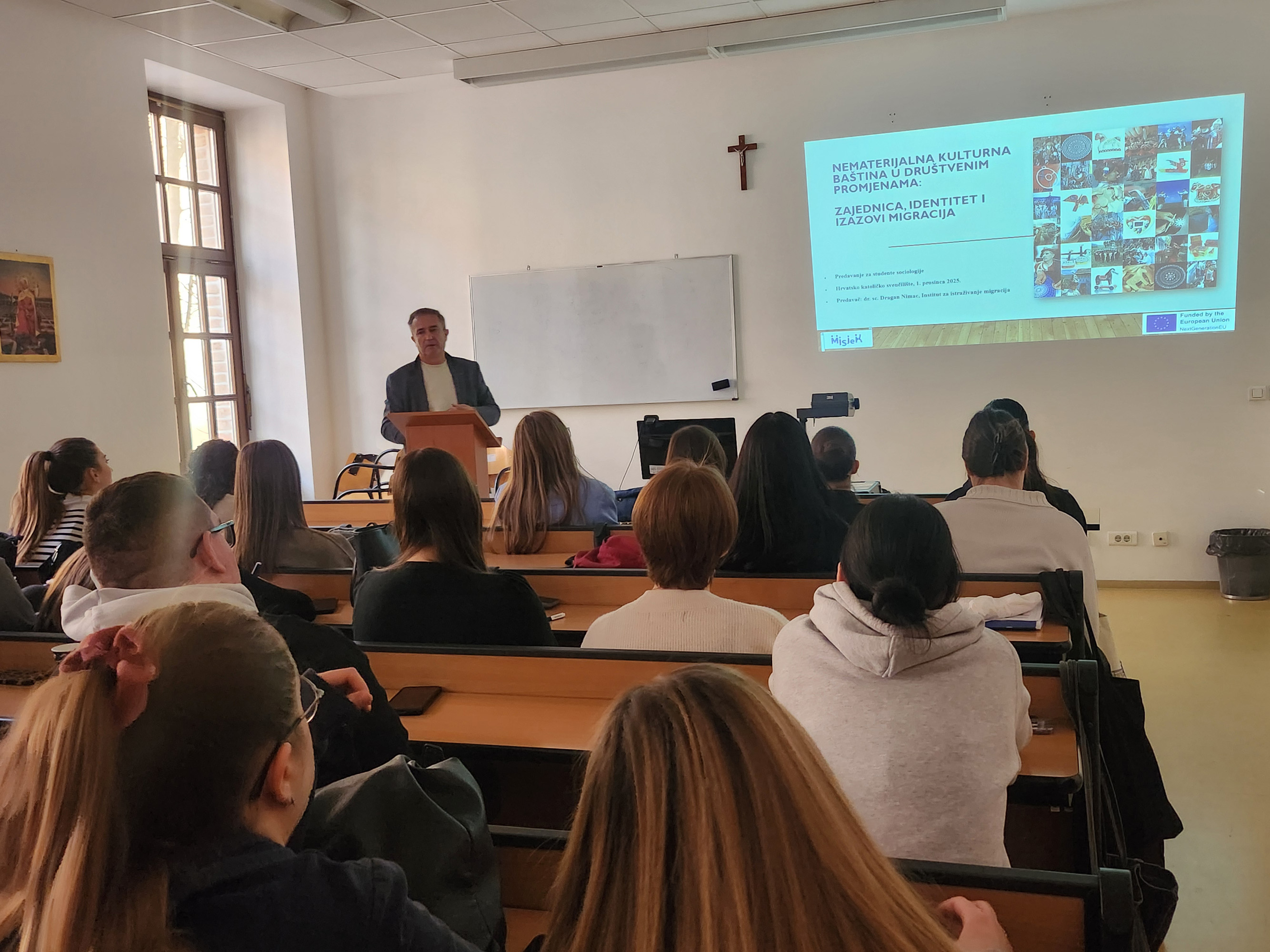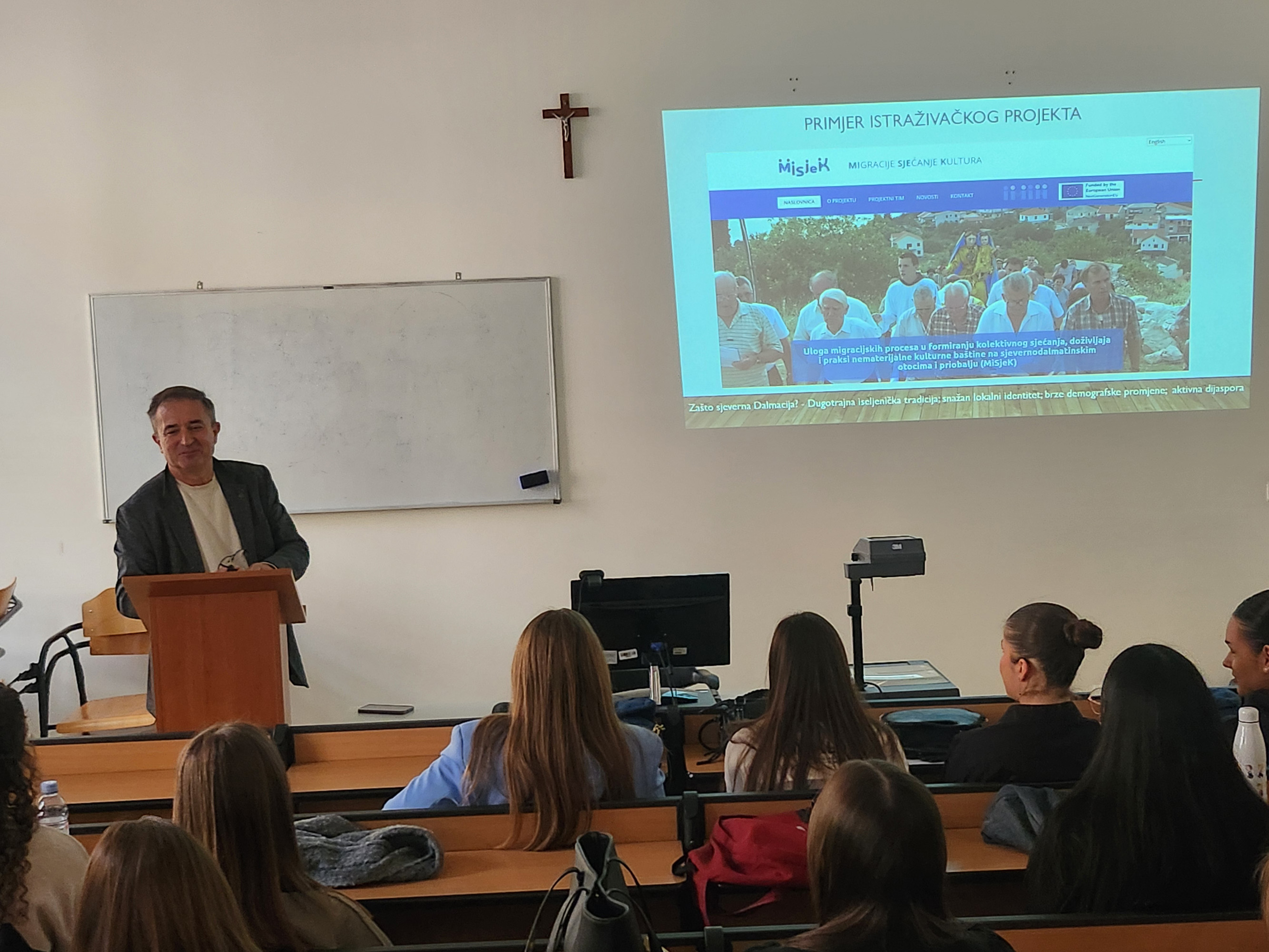 U sklopu gostovanja studentima je predstavljen i znanstveni projekt MISJEK – Uloga migracijskih procesa u formiranju kolektivnog sjećanja, doživljaja i praksi nematerijalne kulturne baštine na sjevernodalmatinskim otocima i priobalju, čiji je voditelj dr. Nimac, a kojeg provodi Institut za istraživanje migracija uz potporu Europske unije, iz programa NextGenerationEU, u suradnji s našim sveučilišnim nastavnicima. Na kraju izlaganja dr. Nimac je zaključio da je nematerijalna kulturna baština dinamična i neprestano u interakciji s društvenim promjenama, te da njezino očuvanje zahtijeva aktivnu ulogu zajednice na lokalnoj i globalnoj razini, uključujući dijasporu, obrazovanje i održivi turizam. Studenti su aktivno sudjelovali u raspravi, povezujući tematske cjeline predavanja i projekta s nastavnim sadržajima, te iskazali interes za daljnje uključivanje u istraživački rad na području sociologije migracija, kolektivnog sjećanja, identiteta i nematerijalne kulturne baštine.