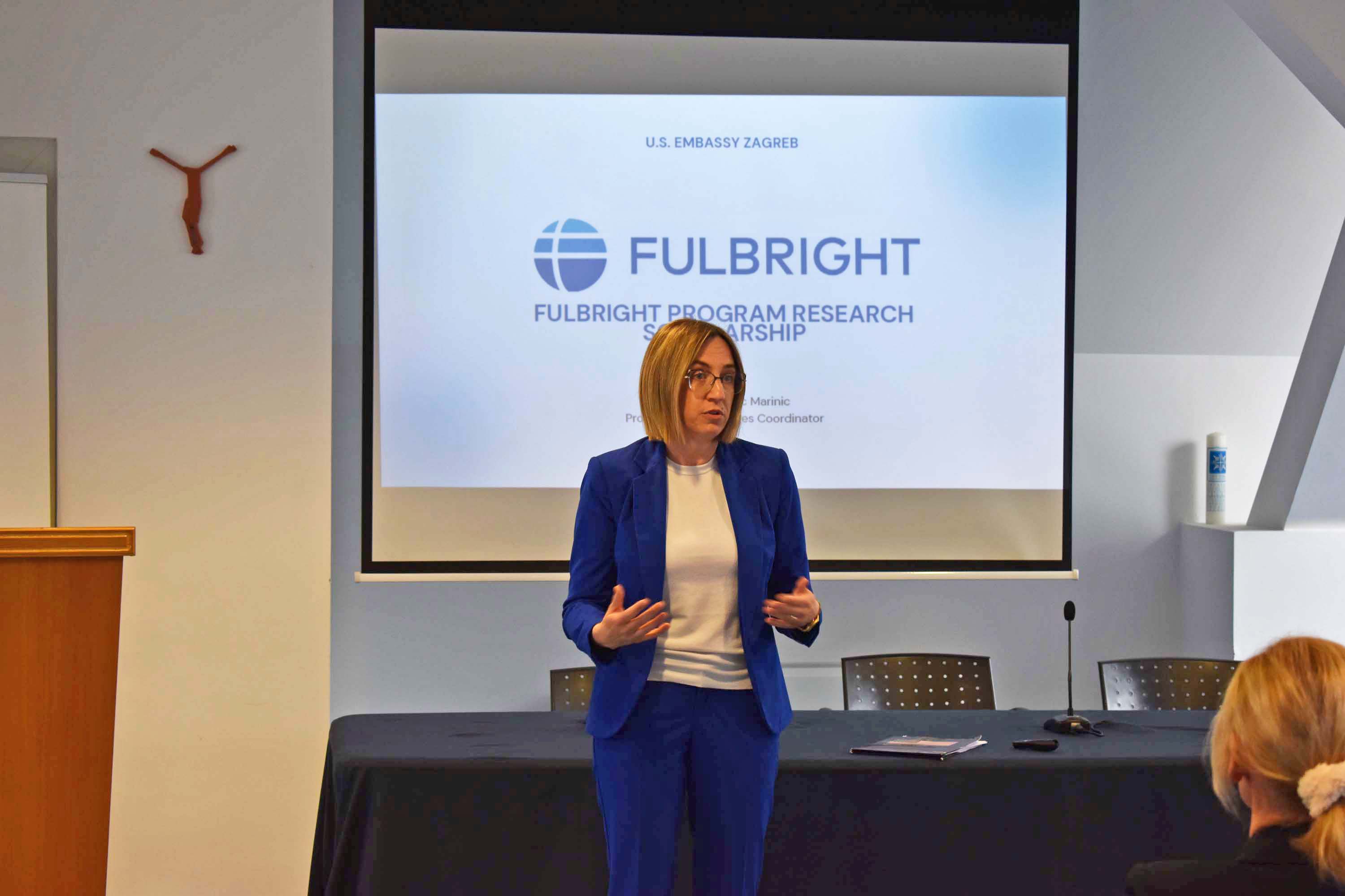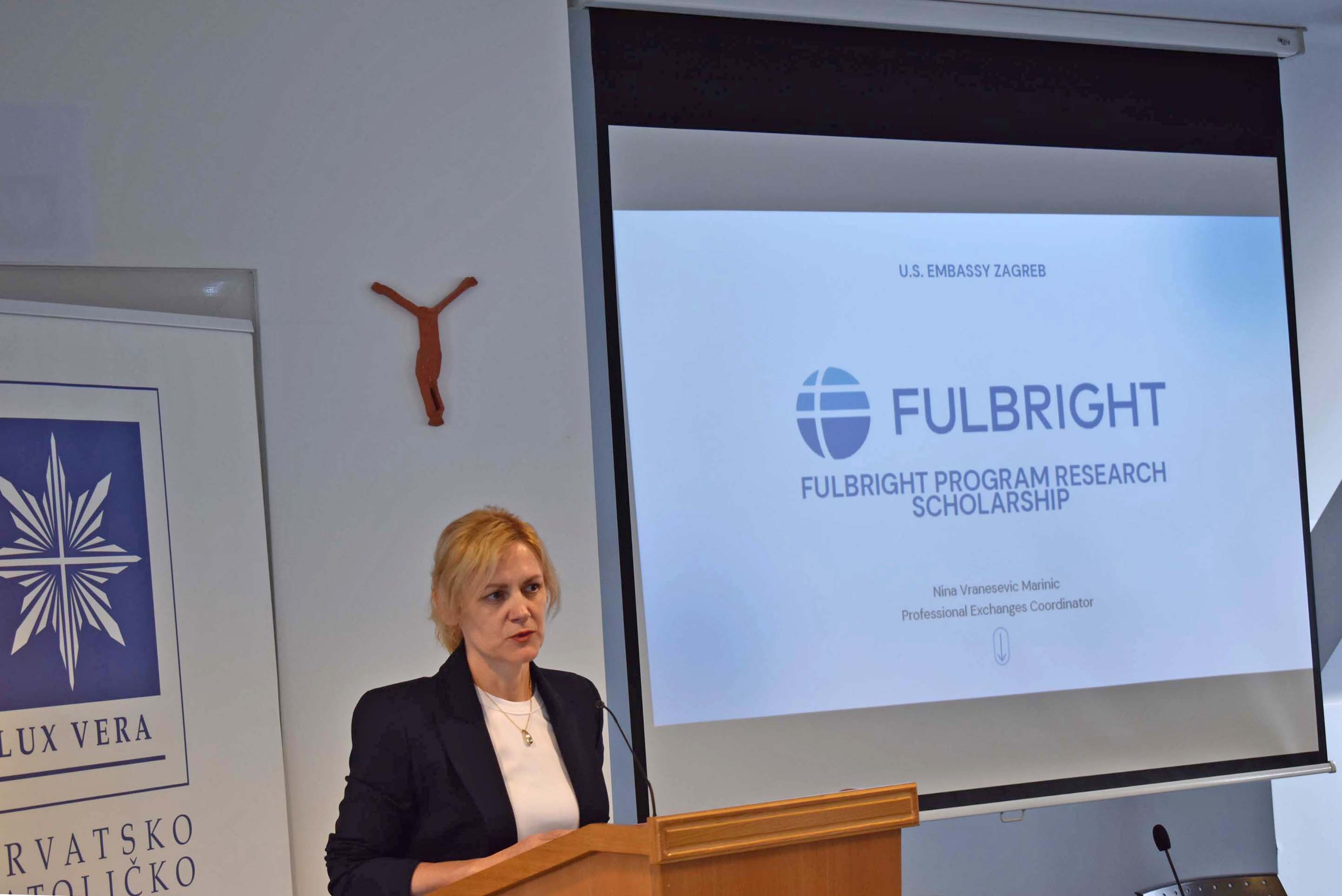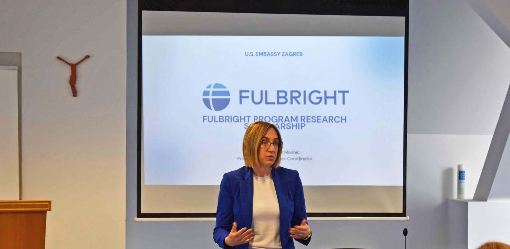 Nina Vranešević Marinić, predstavnica Veleposlanstva SAD-a i koordinatorica za programe razmjene i alumnije, okupljenim nastavnicima i doktorandima HKS-a predstavila je značajke programa, čime se bavi, što je sve potrebno za prijavu i sudjelovanje te u kojim se sve kategorijama hrvatski znanstvenici i doktorandi mogu prijaviti na program.