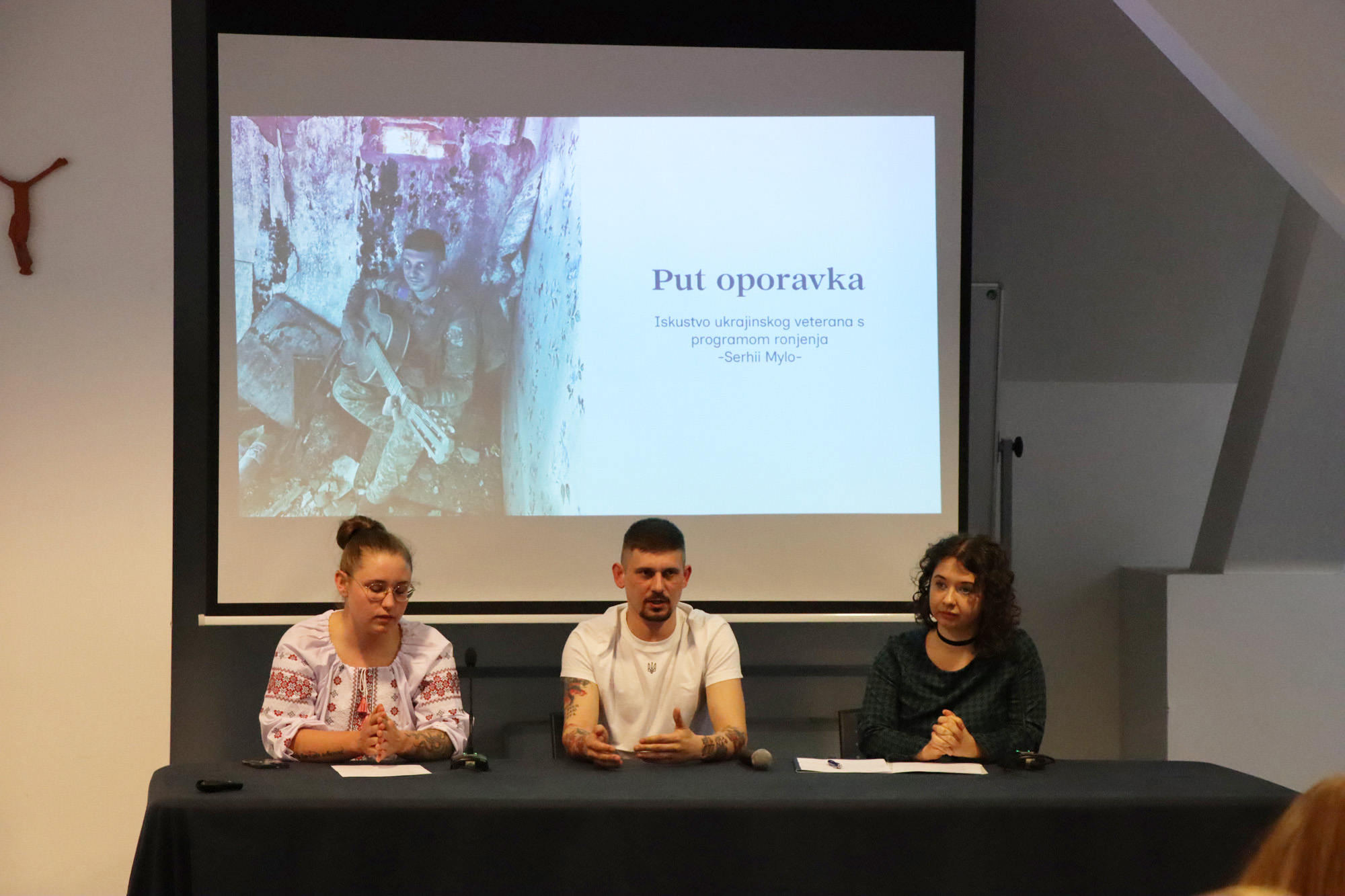 Posebno dojmljiv dio programa odnosio se na temu oporavka i resocijalizacije ukrajinskih branitelja. Naša studentica Jelena Penjin, univ. bacc. psych., u izlaganju Dubine oporavka – ronjenje kao metoda resocijalizacije ukrajinskih veterana, otvorila je važnu temu psihološke podrške i procesa oporavka u okviru programa ronjenja za ukrajinske branitelje nakon teških ratnih iskustava. Osobitu snagu programu dalo je i svjedočanstvo Serhiia Myla, ukrajinskog branitelja koji je uz pomoć prevoditeljice Anne Komarytsie, mag. philol., na snažan i neposredan način približio osobno iskustvo oporavka, otpornosti i ponovne integracije u svakodnevni život.