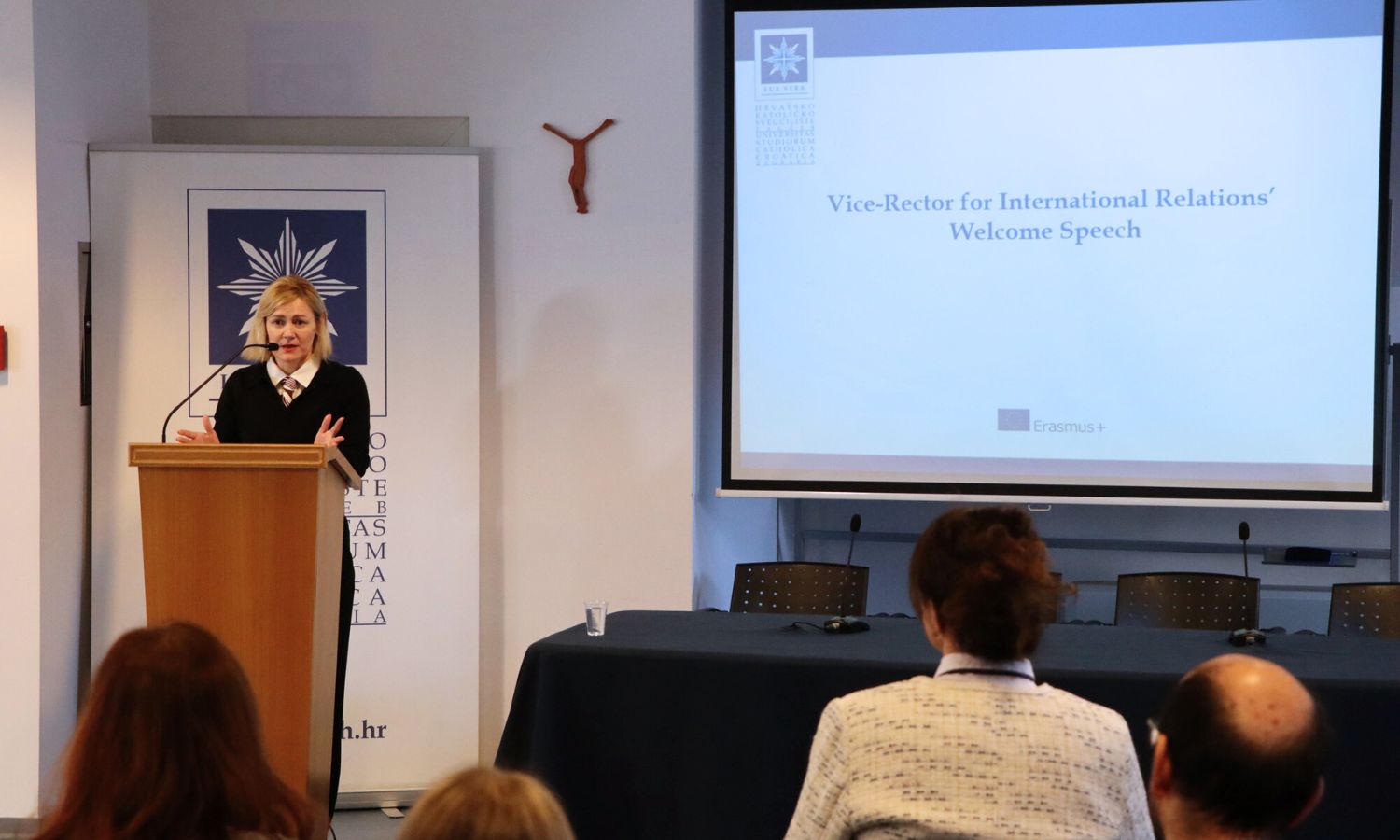 Okupljene studente pozdravila je prorektorica za međunarodnu suradnju, prof. dr. sc. Jasna Ćurković Nimac, naglasivši važnost internacionalizacije, otvorenosti prema različitostima i aktivnog uključivanja studenata u akademski i društveni život Sveučilišta. Također je istaknula kako Erasmus mobilnost predstavlja više od akademske razmjene - ona je prilika za osobni rast, međukulturni dijalog i stvaranje trajnih prijateljstava.