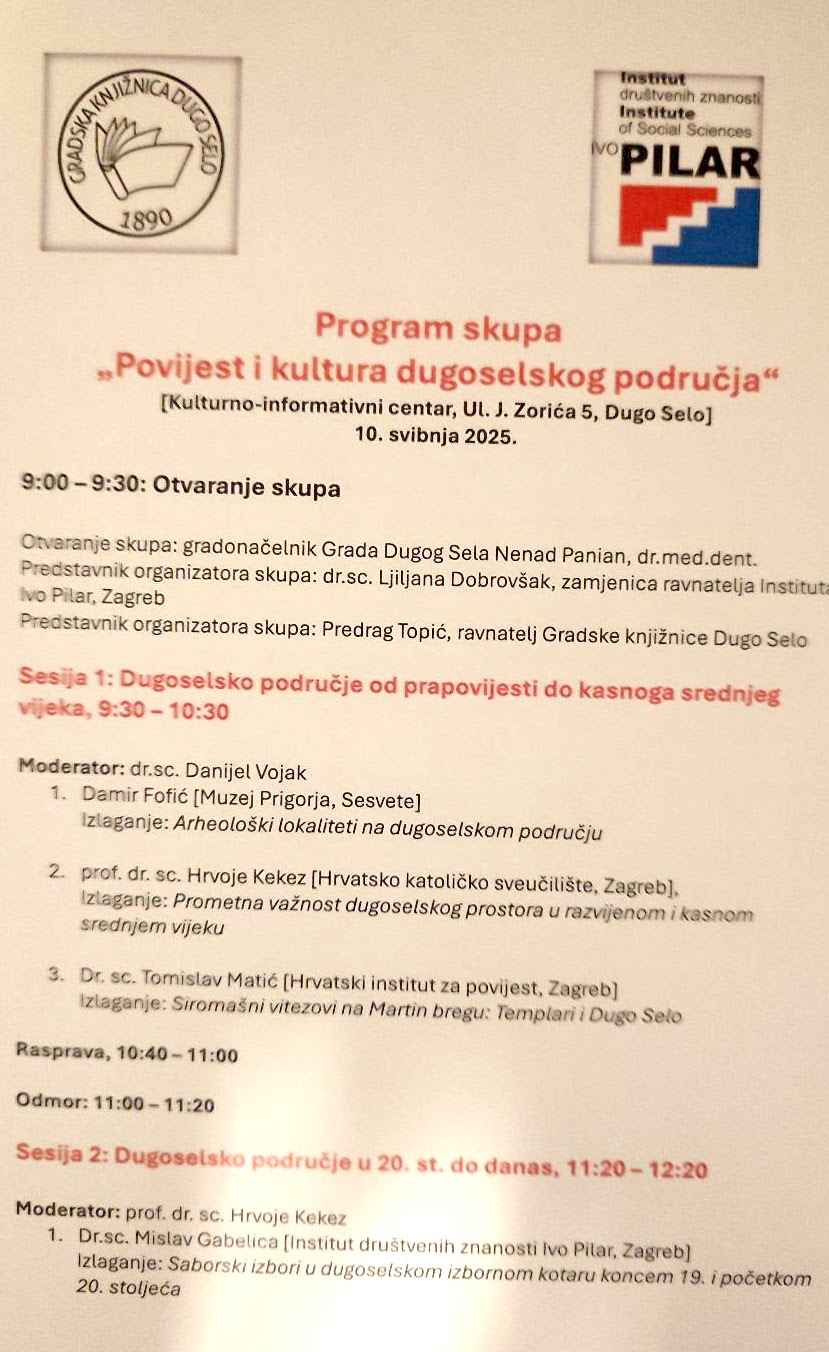 U Kulturno-informativnom centru Dugo Selo 10. svibnja 2025. je održan znanstveni skup pod nazivom „Povijest i kultura dugoselskog područja“, koji je okupio vodeće povjesničare, arheologe i istraživače iz različitih institucija s ciljem rasvjetljavanja bogate baštine ovoga kraja. Organizatori skupa bili su Gradska knjižnica Dugo Selo i Institut društvenih znanosti Ivo Pilar iz Zagreba. Na skupu su sudjelovali i članovi projekta MEDITOP. Tako je prof. dr. sc. Hrvoje Kekez, voditelj projekta, održao izlaganje na temu „Prometna važnost dugoselskog prostora u razvijenom i kasnom srednjem vijeku“, dok je doc. dr. sc. Tomislav Matić, suradnik projekta, izlagao na temu „Siromašni vitezovi na Martin bregu. Templari i Dugo Selo“.