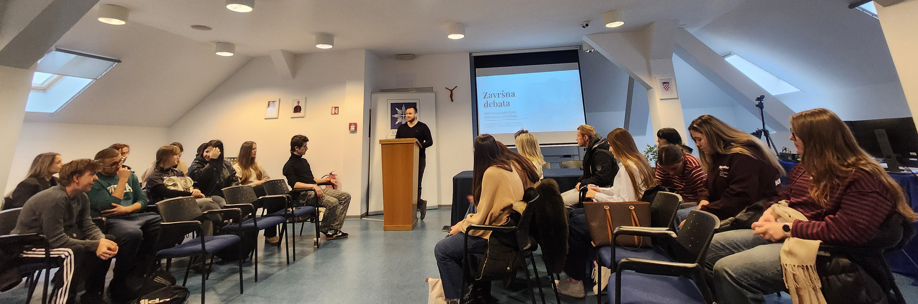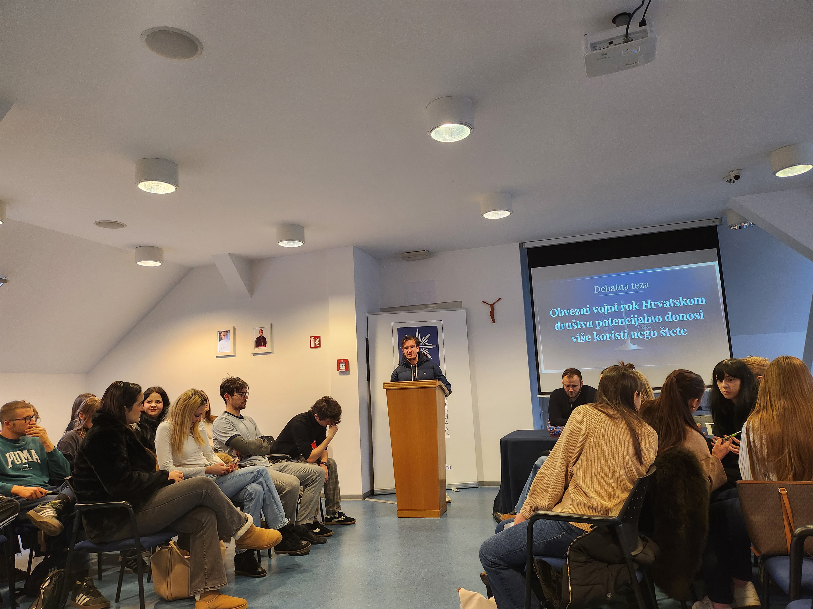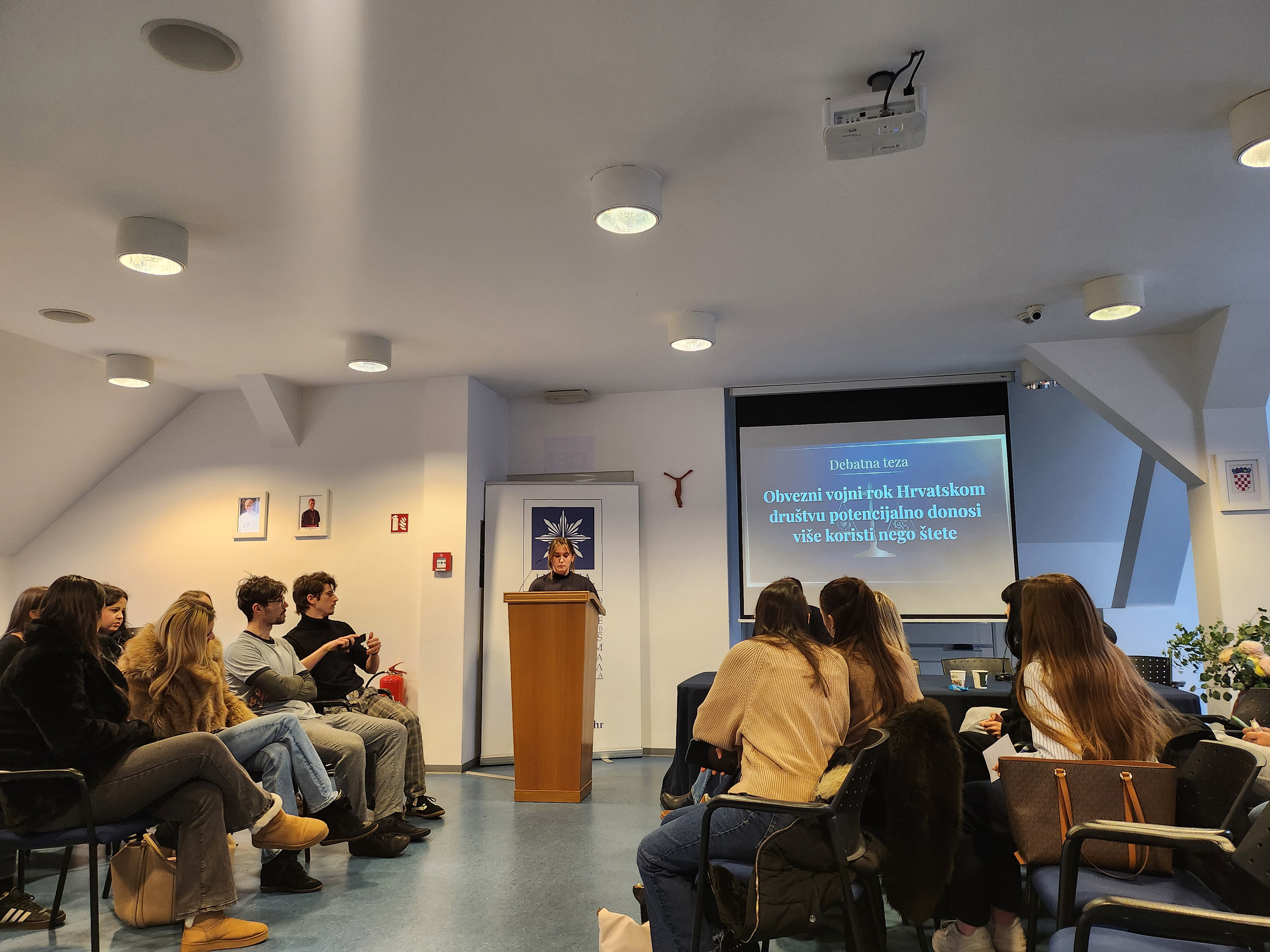 U petak, 23. siječnja 2026., na Sveučilišnom odjelu za sociologiju održana je debata studenata sociologije u sklopu kolegija Radionica temeljnih pojmova u sociologiji na kojem surađuju izv. prof. dr. sc. Ivana Brstilo Lovrić, doc. dr. sc. Damir Mravunac i asistent Lovro Knežević, univ. mag. soc., koji je ujedno organizirao i moderirao susret na temu uvođenja obveznog vojnog roka u hrvatskom društvu.