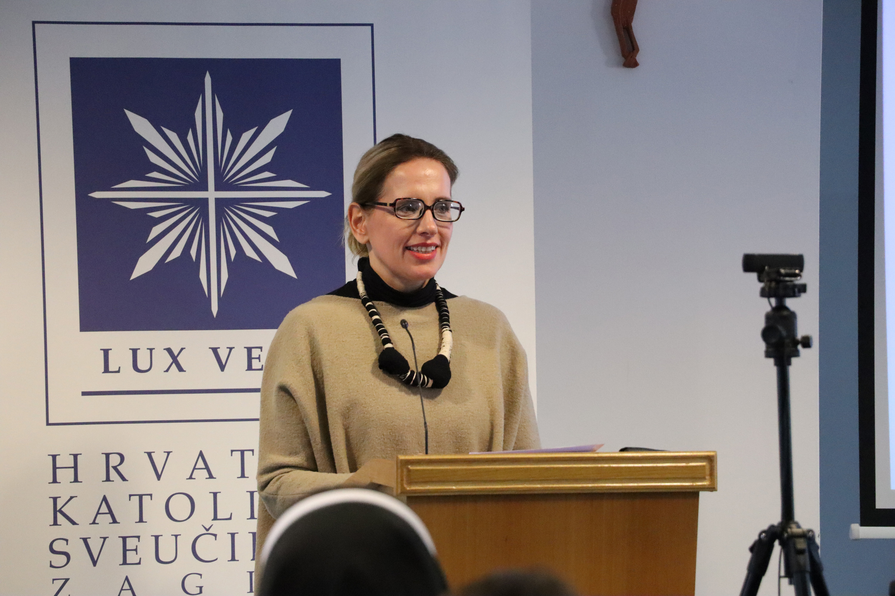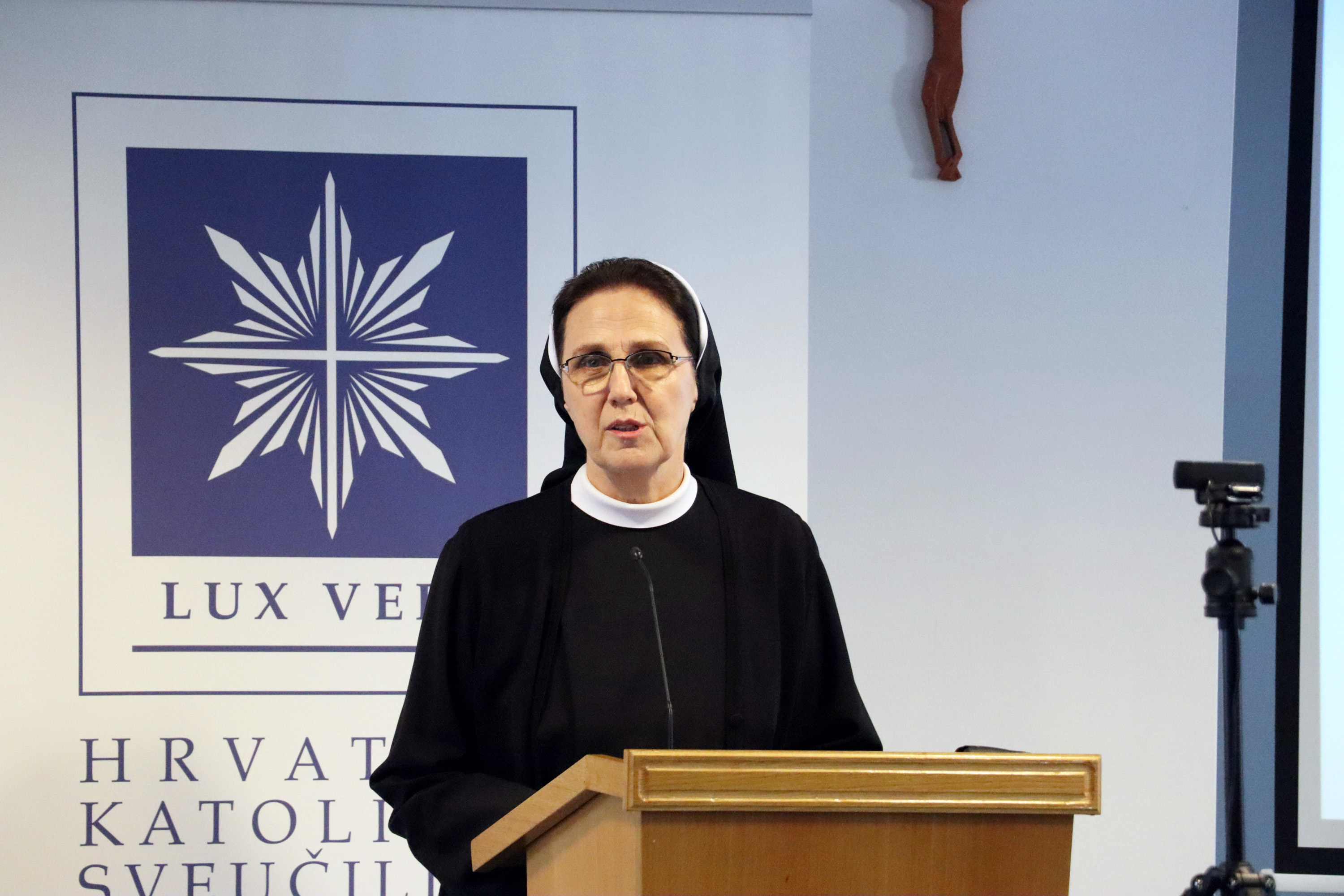 Prvo predavanje održala je prof. dr. sc. Marija Pehar s Katoličkog bogoslovnog fakulteta Sveučilišta u Zagrebu na temu "Teologija i umjetnost na putu traganja za Svetim".