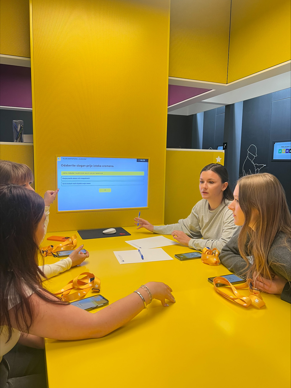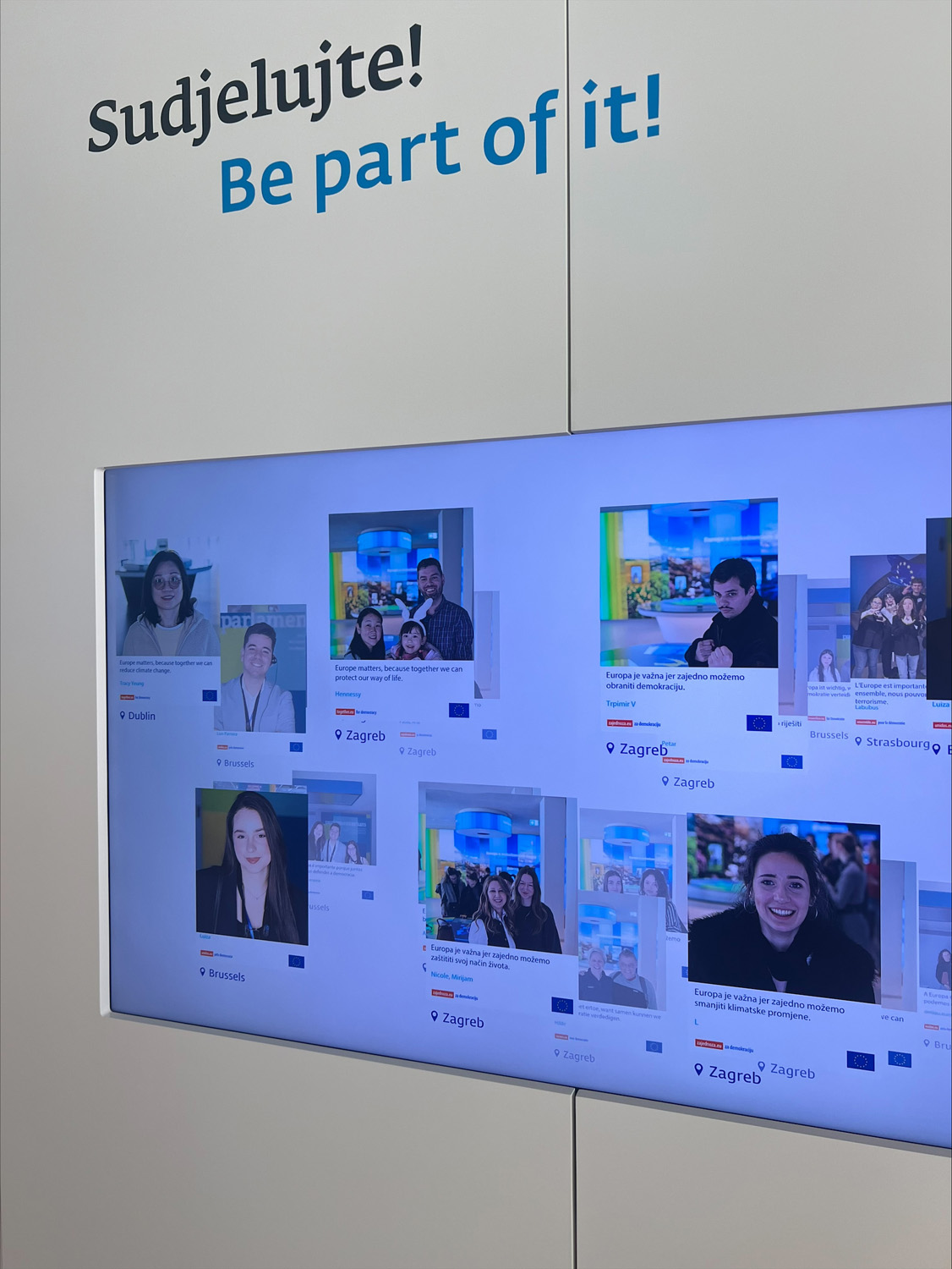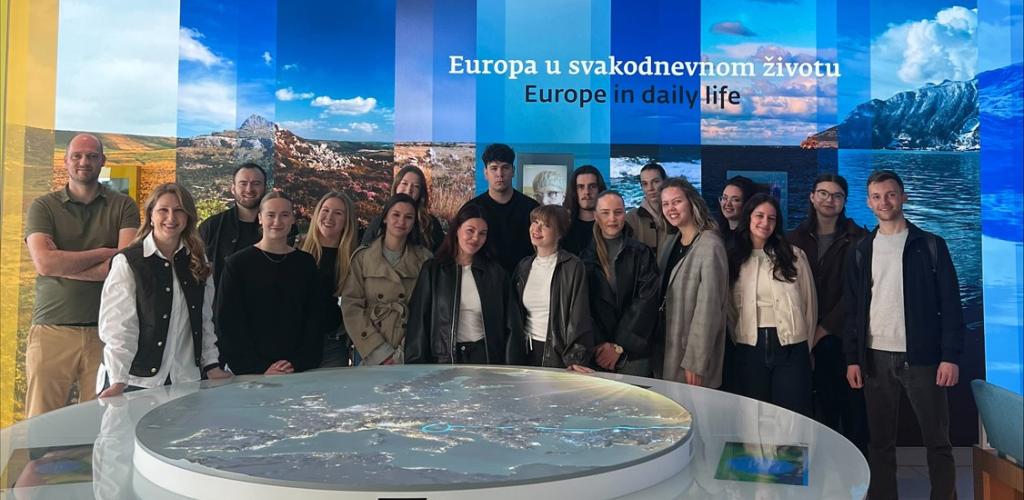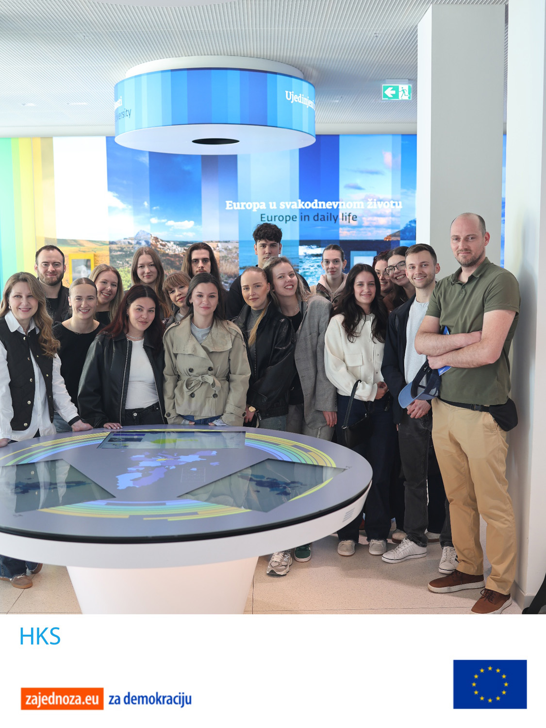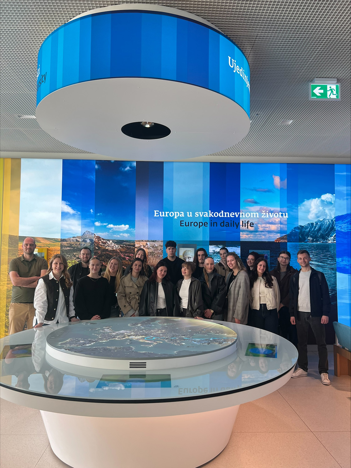 U petak, 10. travnja 2026., studenti sociologije u okviru kolegija Završni ispit i Introduction to European Integration posjetili su multimedijski centar Doživi Europu. Terenska nastava održana je pod vodstvom doc. dr. sc. Miriam Mary Brgles, doc. dr. sc. Jeronima Dorotića i asistenta Lovre Kneževića, a sudjelovala je i studentica Nicole Bogdanow, koja boravi na dolaznoj Erasmus mobilnosti.