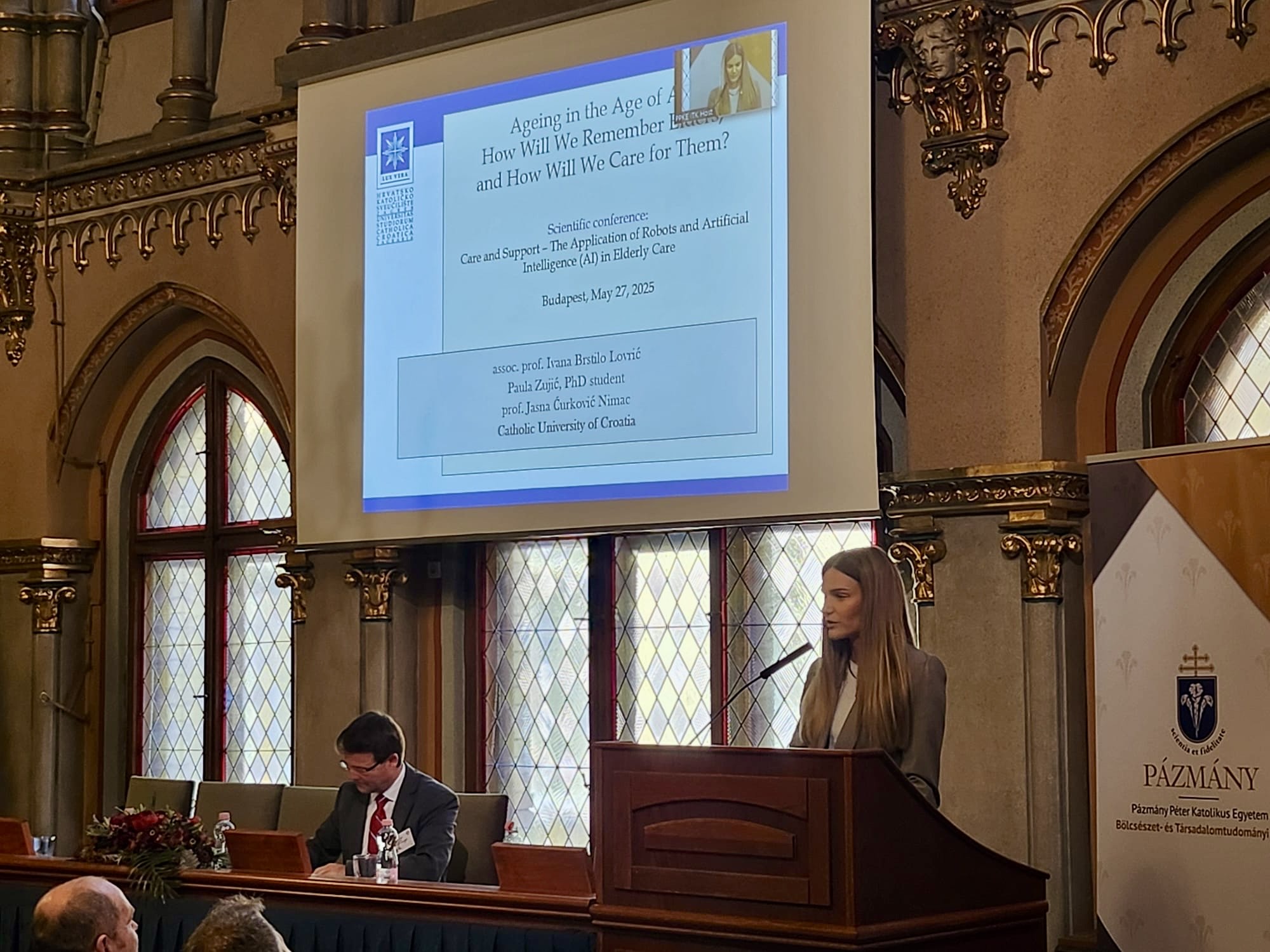 U utorak 27. svibnja 2025. godine, predstavnici Hrvatskog katoličkog sveučilišta sudjelovali su na međunarodnoj konferenciji Care and Support – Applications of Robots and Artificial Intelligence (AI) in Elderly Care održanoj u Budimpešti, gdje su predstavili svoja izlaganja vezana uz primjenu umjetne inteligencije u skrbi za starije osobe.