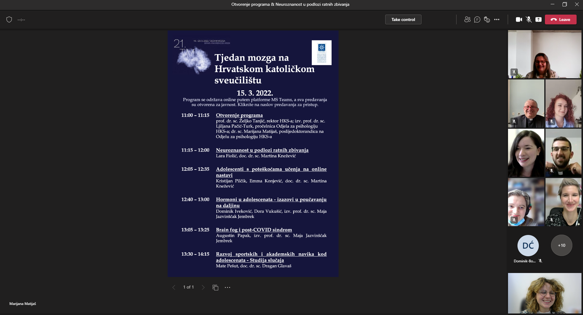 U utorak, 15. ožujka 2022. obilježen je 21. Tjedan mozga na Odjelu za psihologiju Hrvatskog katoličkog sveučilišta. Sva predavanja su održana online putem platforme MS Teams, te su bila otvorena za javnost. Program su otvorili Rektor Hrvatskog katoličkog sveučilišta prof. dr. sc. Željko Tanjić, pročelnica Odjela za psihologiju izv. prof. dr. sc. Ljiljana Pačić-Turk i dr. sc. Marijana Matijaš, poslijedoktorandica na Odjelu za psihologiju.
