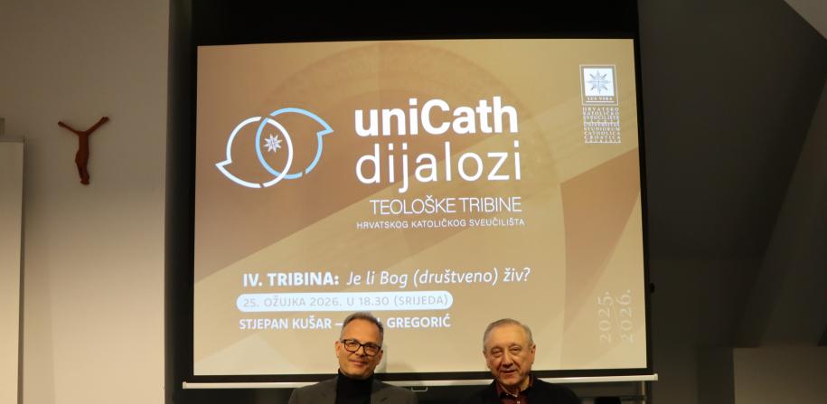 U srijedu 25. ožujka 2026. na Hrvatskom katoličkom sveučilištu održana je četvrta po redu teološka tribina u ciklusu Unicath dijalozi.Nakon što ih je moderatorica dr.sc. Kristina Vujica predstavila, izlagači prof. dr. sc. Stjepan Kušar s Hrvatskog katoličkog sveučilišta i dr. sc. Pavel Gregorić s Instituta za filozofiju imali su petnaestominutno izlaganje na temu „Je li Bog (društveno) živ?“Prof. Kušar je svoje izlaganje smjestio unutar kršćanske religiozne opcije i predstavio ga kao izraz…