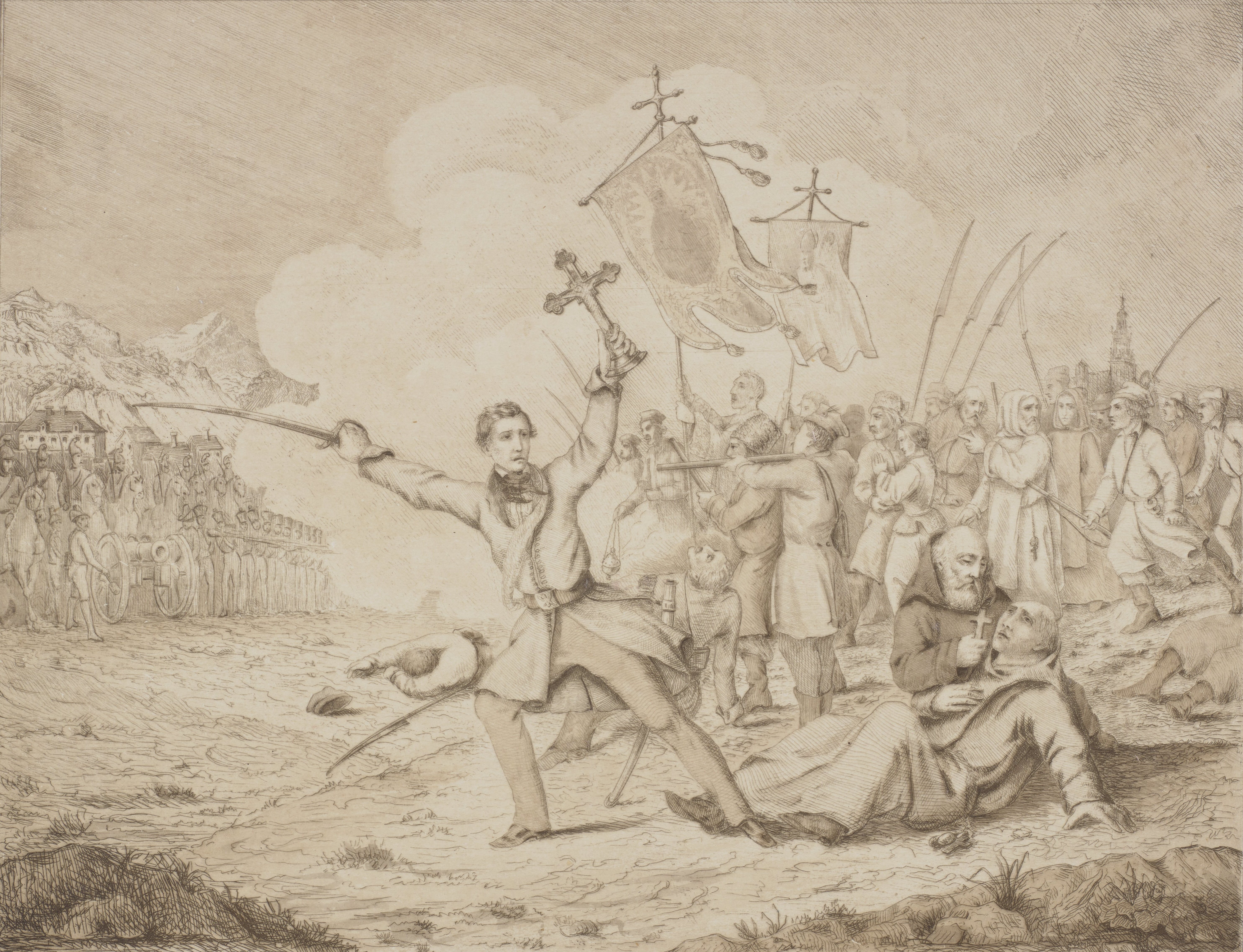 Veliku ulogu u pokušaju pridobivanja seljaka imao je već spomenuti Edward Dembowski. Kao ideolog ustanka vjerovao je da će društvene reforme uvjeriti seljake da se pridruže revoluciji. Dana 27. veljače poveo je veliku procesiju kroz sela oko Krakova s križevima i revolucionarnim zastavama. Međutim, austrijski vojnici započeli su paljbu na povorku i Dembowski je poginuo. Smrt glavnog ideologa bila je težak udarac ustanku. U tome se očituje ključni paradoks ustanka. Dembowski je vjerovao da vojska neće pucati na križ i vjersku procesiju. Pucnjava na procesiju simbolizira kraj starog svijeta u kojem je religija bila svojevrsni štit, što ujedno predstavlja vrhunac cijele priče. Njegova pogibija pod križem simbolički označava kraj poljskog romantizma i početak surove realpolitike.