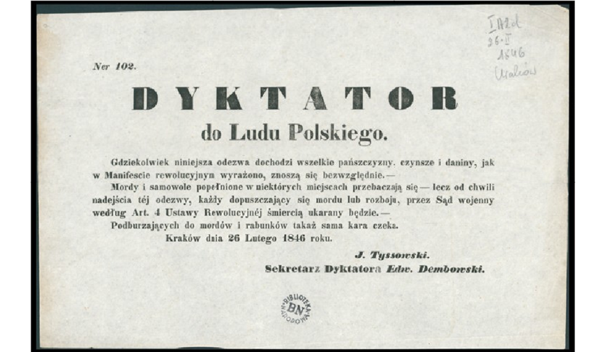 Deset godina kasnije, u veljači 1846. ta načela bila su nit vodilja novog ustanka koji je obuhvatio slobodni grad Krakov i okolna područja. Revolucionari su odmah uspostavili vladu na čije je čelo kao diktator postavljen Jan Tyssowski. Njegovi proglasi imali su oblik službenih državnih naredbi. Jedan od glavnih ideologa programa bio je Edward Dembowski, mladi filozof i radikalni demokrat koji je zagovarao povezivanje nacionalnog ustanka sa seljačkom revolucijom. Revolucionarna vlast vrlo brzo je počela izdavati niz proglasa i letaka – političkih, vojnih i društvenih – kojima je pokušala mobilizirati pučanstvo. Glavni proglas „Manifest za poljsku naciju od strane poljske nacionalne vlade” od 22. veljače ozbiljno je apelirao na narod: Poljaci! Došlo je vrijeme ustanka! Rastrgana zemlja se uzdiže i ujedinjuje. (...) Neka svaki Poljak uzme oružje. Neka se narod digne kao jedan čovjek. Tada će Poljska uskrsnuti. U tekstu se podsjeća na zatvore, progone i poniženja koja su Poljaci trpjeli pod stranim vlastima te se narod diljem poljskih zemalja poziva da ustane protiv okupatora. Istog dana donesen je i „Revolucionarni zakon” od sedam članaka, a služio je kao kratki program društvene i političke revolucije. Svrha mu je bila jasno odrediti temeljne promjene u društvu, posebno prema seljacima i feudalnom sustavu. Jedan od najpoznatijih proglasa revolucije objavljen je 23. veljače 1846. i upućen je svim Poljacima koji znaju čitati. U njemu se naređuje da svaki pismeni čovjek okupi narod i naglas objasni ciljeve ustanka kako bi svi razumjeli što revolucija želi postići. U tekstu se izričito kaže da revolucija ukida plemićke i gradske privilegije i sve ljude čini jednakima. Seljacima je obećano ukidanje feudalnih obveza i jednaka prava, a narod se poziva da ustane protiv austrijskog cara, Prusa i Rusa („Moskovljana”) koji su podijelili poljske zemlje: Onima koji zemlje nemaju — nakon pobjede, a osobito onima koji se bore u redovima Republike — iz Narodnih dobara, nakon završene borbe za neovisnost, bit će dodijeljena zemlja — a za obrtnike će biti osnovane narodne radionice — gdje će plaća za rad biti veća nego što je bila dosad. Republika Poljska sve povlastice, plemićke i gradske, ukida — i sve ljude čini jednakima.