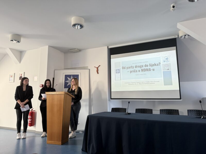 Drugo predavanje Od party droge do lijeka? – priča o MDMA-u su pripremile i održale studentice psihologije Antea Crnjak, Vanessa Caganić i Sara Novosel pod mentorstvom prof. dr. sc. Maje Jazvinšćak Jembrek.