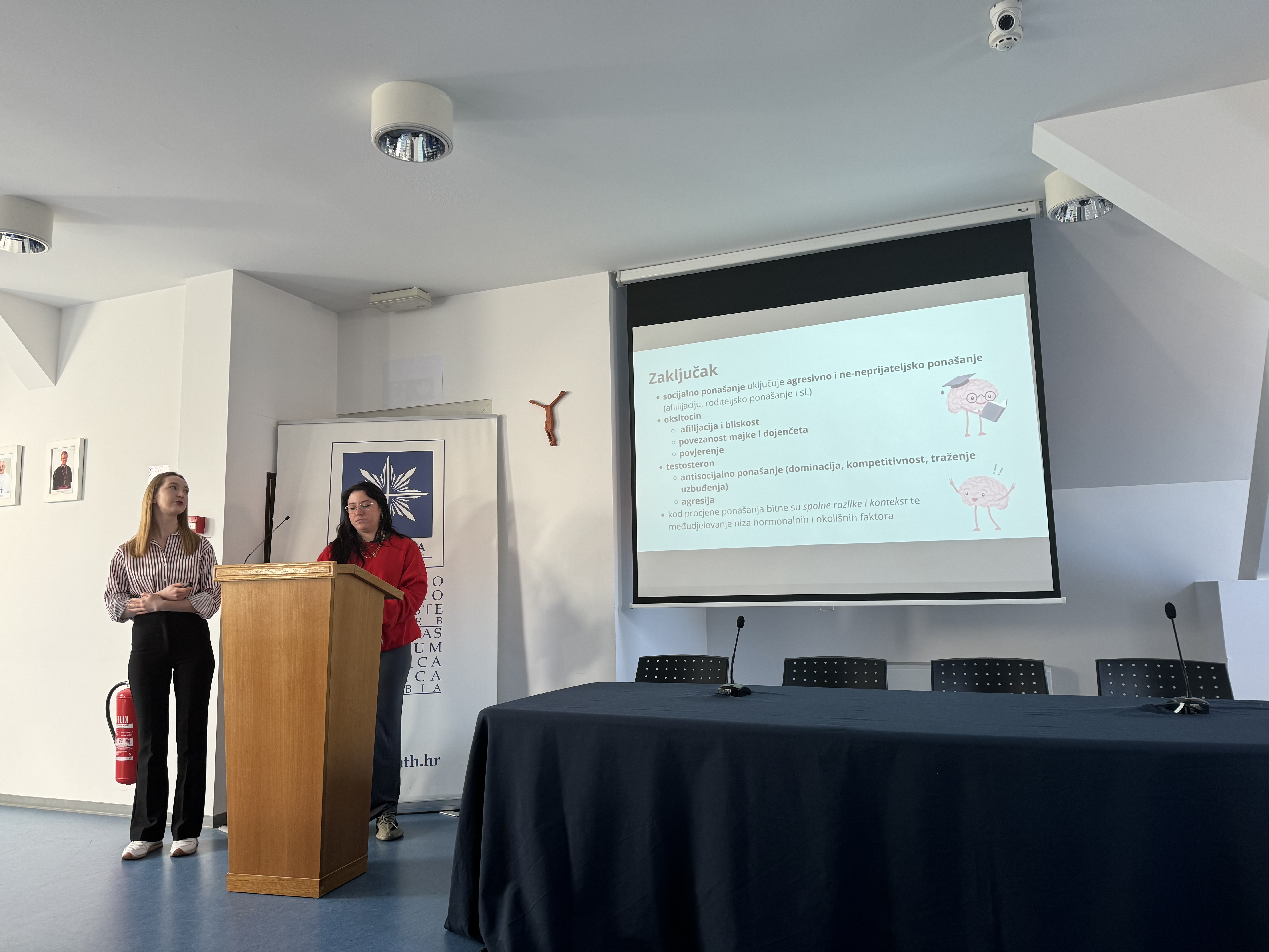 Prvo predavanje Uloga oksitocina i testosterona u regulaciji socijalnog ponašanja i agresivnosti održale su studentice psihologije Ema Šimunić i Anamarija Gregurović pod mentorstvom prof. dr. sc. Maje Jazvinšćak Jembrek.
