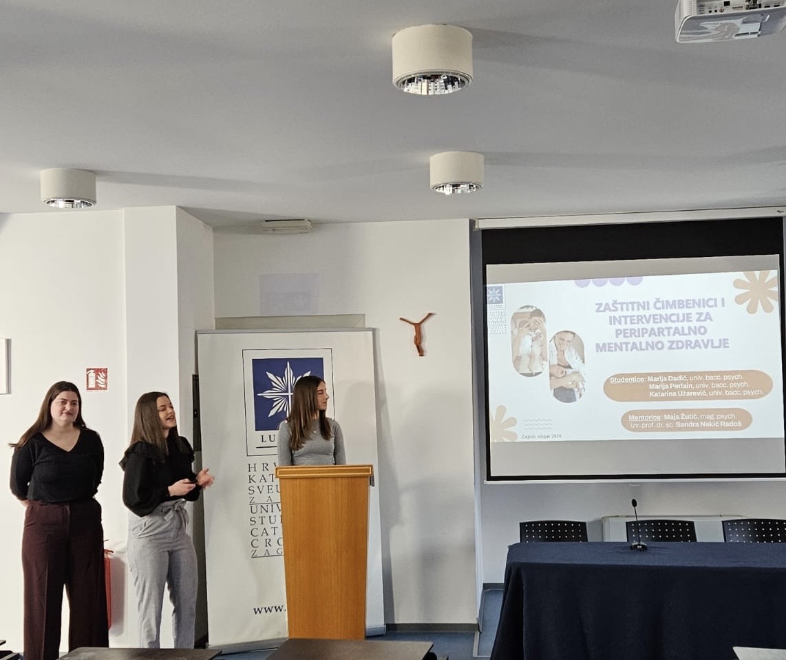 Na kraju programa, studentice Marija Dadić, Marija Perlain i Katarina Užarević pod mentorstvom Maje Žutić, mag. psych. i izv. prof. dr. sc. Sandra Nakić Radoš, univ. spec. clin. psych. održale su predavanje Zaštitni čimbenici i intervencije za peripartalno mentalno zdravlje.