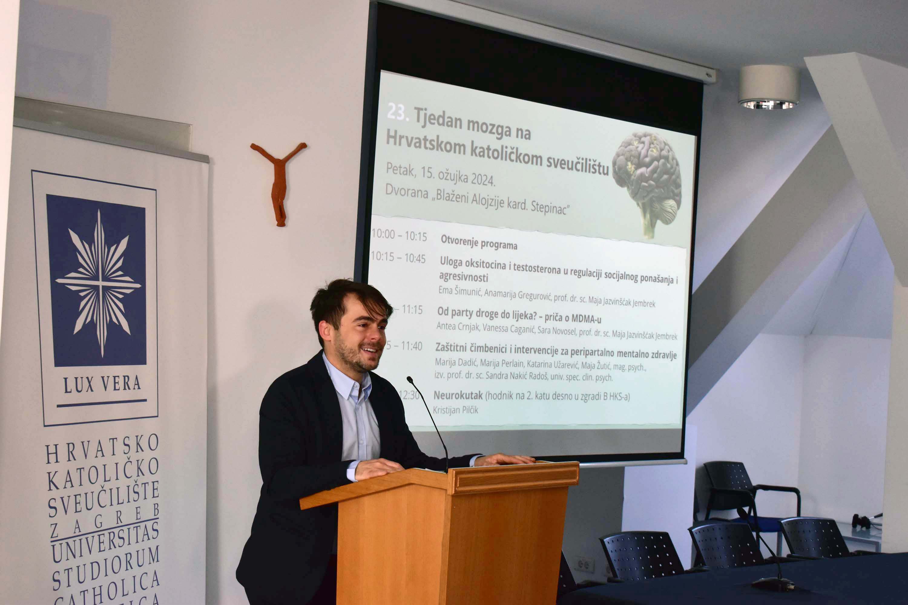 U tjednu od 11. do 17. ožujka 2024. godine održao se 23. po redu Tjedan mozga, a ove godine, po osmi puta obilježavanju ove manifestacije pridružio se i Sveučilišni odjel za psihologiju Hrvatskog katoličkog sveučilišta! Glavni organizatori bili su dr. sc. Marijana Matijaš i dr. rer. nat. Dominik-Borna Ćepulić. Program obilježavanja Tjedna mozga na HKS-u održao se u petak 15. ožujka 2024. u okviru kojeg su studenti pod mentorstvom nastavnika našeg odjela pripremili nekoliko predavanja. Na samom početku programa, sudionike je pozdravio pročelnik Sveučilišnog odjela za psihologiju doc. dr. Dragan Glavaš, prorektor za nastavu prof. dr. sc. Roko Mišetić te dr. rer. nat. Dominik-Borna Ćepulić koji je vodio program.