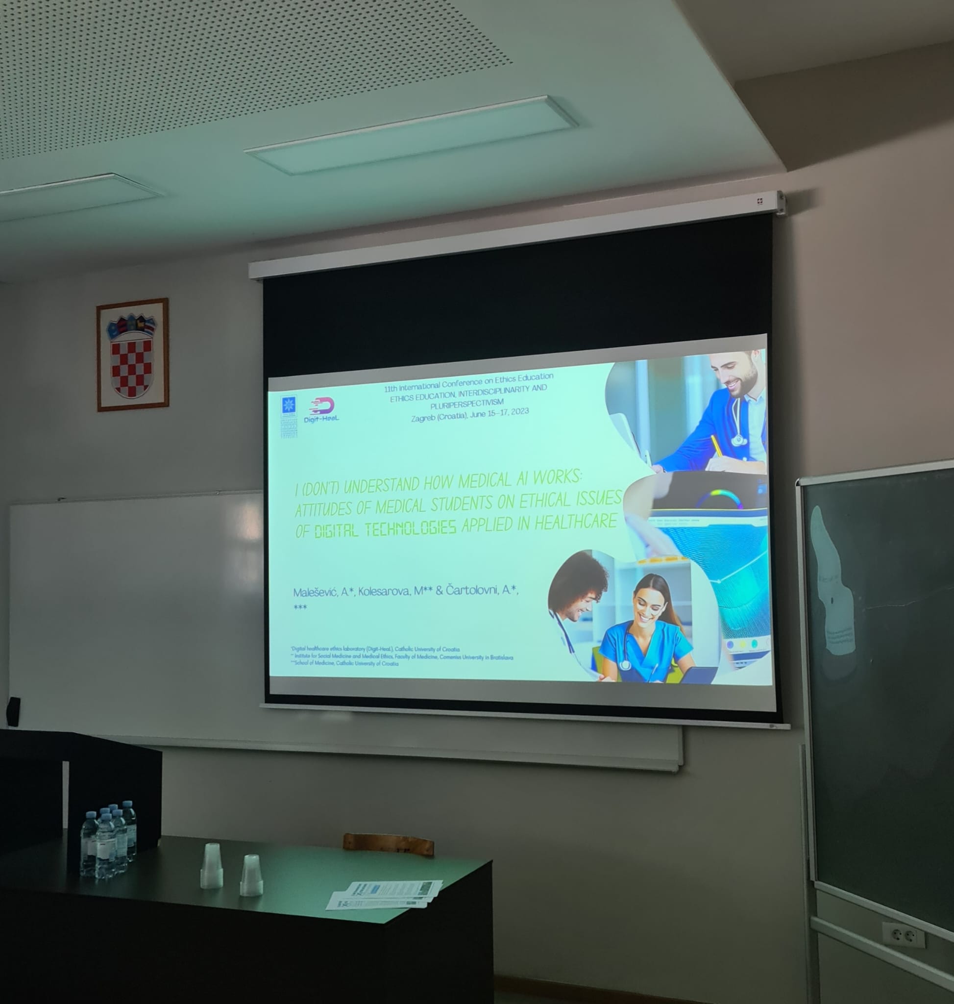 From June 15th to 17th, the 11th International Conference on Ethics Education - Ethics Education, Interdisciplinarity, and Pluriperspectivism took place in Zagreb, organized by the International Association for Education in Ethics. Members of the Digit-HeaL research group, Anamaria Malešević, Mária Kolesárová, and Anto Čartolovni, presented a paper titled I Understand How Medical AI Works: Attitudes of Medical Students on Ethical Issues of Digital Technologies Applied in Healthcare. The presentation was based on the results of a quantitative study conducted earlier by the research group among medical students in Croatia and Slovakia.