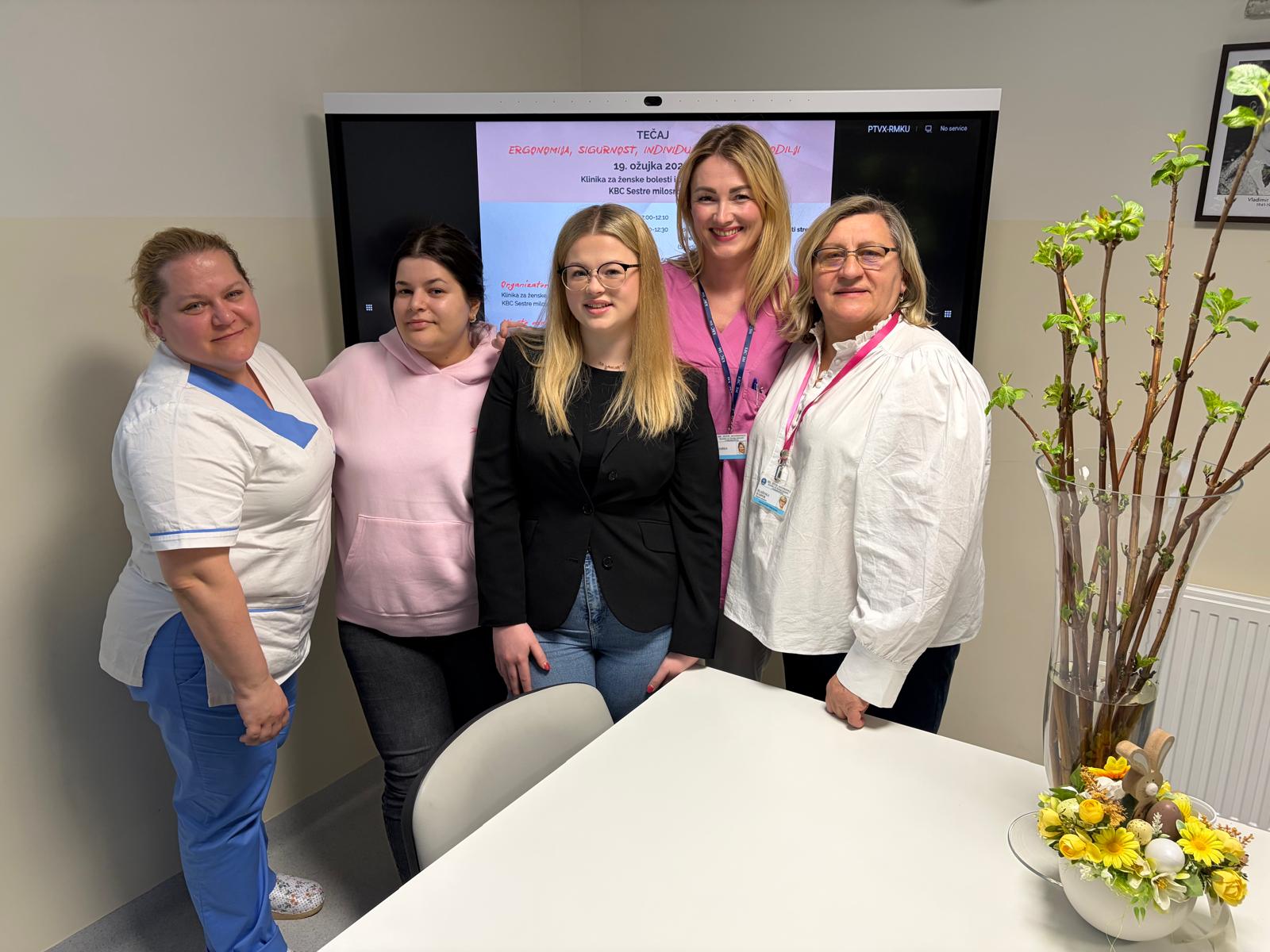 First-year undergraduate midwifery students Patricia Bogdanović, Karla Strugar, Ivana Grgić, and Ana Marija Grgić participated in a professional course titled “Ergonomics, Safety and an Individual Approach to the Woman in Labour,” organized by the Clinic for Gynecology and Obstetrics of the Sisters of Charity University Hospital Centre.