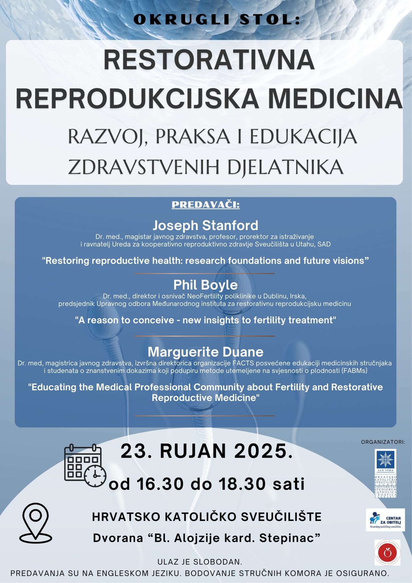 Pozivamo vas na okrugli stol “Restorativna reprodukcijska medicina – razvoj, praksa i edukacija zdravstvenih djelatnika” koji će se održati u dvorani "Bl. Alojzije kard. Stepinac" (zgrada B, treći kat) na Hrvatskom katoličkom sveučilištu u utorak 23. rujna 2025. u trajanju od 16.30 do 18.30 sati.