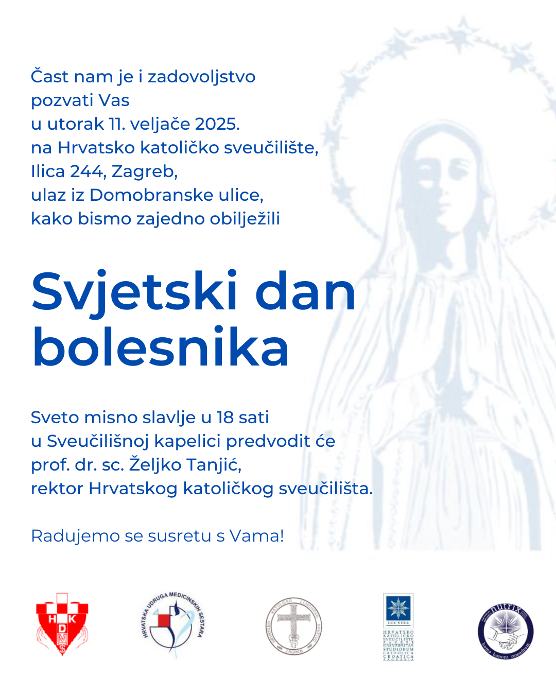 Na Hrvatskom katoličkom sveučilištu Svjetski dan bolesnika zajedno će obilježiti u utorak 11. veljače 2025. Sveučilišni odjel za sestrinstvo HKS-a, Hrvatsko katoličko liječničko društvo (HKLD), Hrvatsko katoličko društvo medicinskih sestara i tehničara (HKDMST) i Hrvatska udruga medicinskih sestara (HUMS).