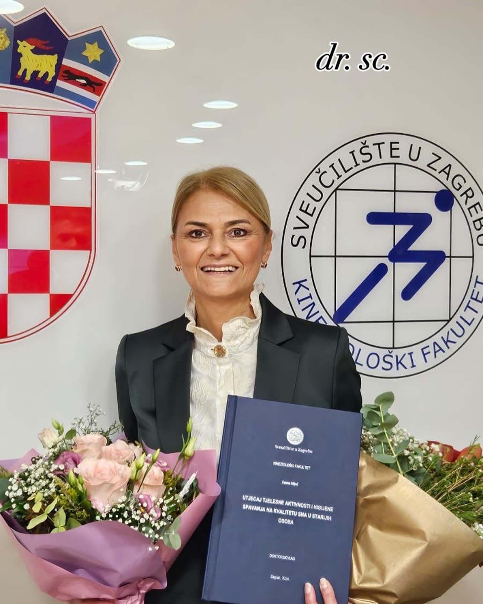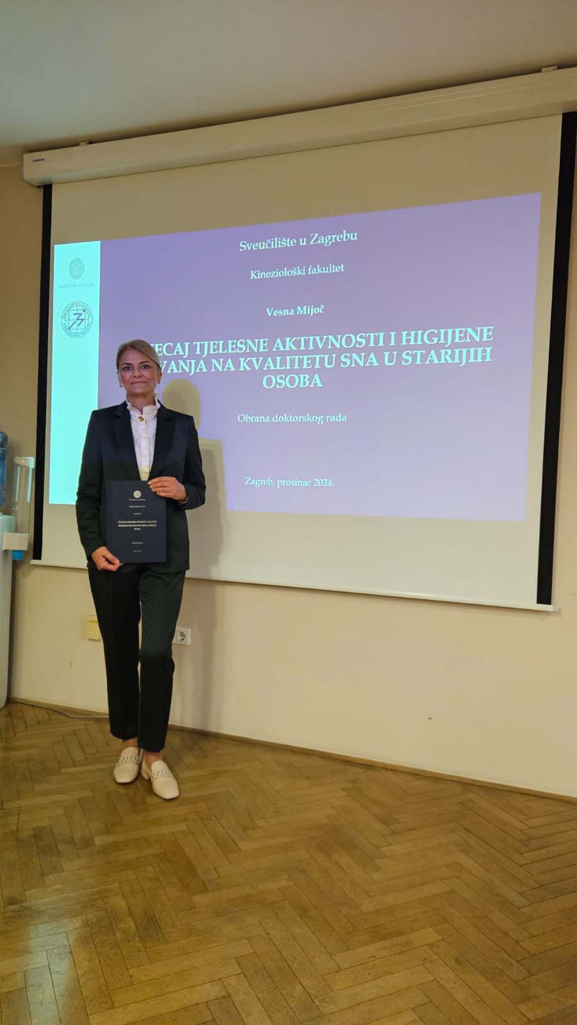 On Tuesday, December 17, 2024, senior lecturer from the University Department of Nursing Vesna Mijoč defended her doctoral thesis "The influence of physical activity and sleep hygiene on the quality of sleep in the elderly" at the Faculty of Kinesiology of the University of Zagreb and earned the title of Doctor of Science!