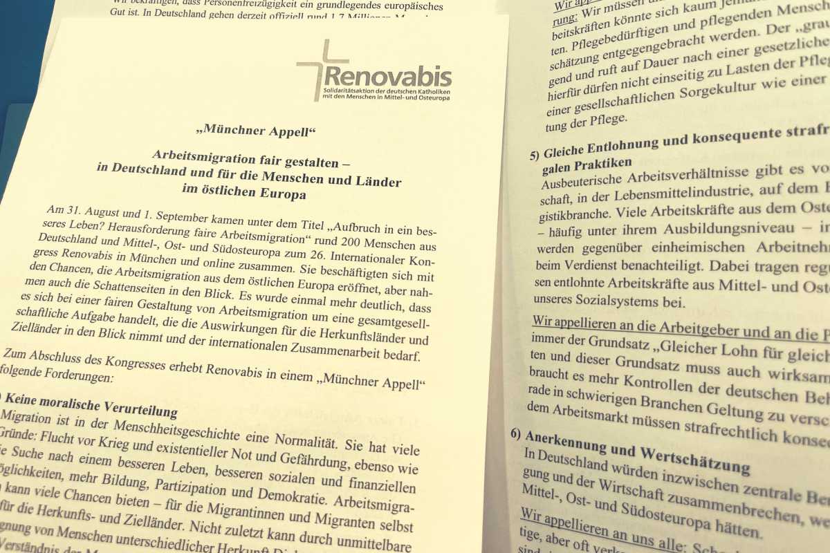 Središnji zahtjev Münchenskog apela jest „jednaka plaća za isti rad na istom mjestu.“ Ne bi se smjelo dogoditi da zaposlenici iz istočne Europe budu u nepovoljnijem položaju u odnosu na lokalne zaposlenike. „Ovo načelo također se mora učinkovito provoditi“, istaknuo je na kraju kongresa generalni direktor Renovabisa Thomas Schwartz. To zahtijeva veće kontrole njemačkih vlasti kako bi se ostvarila radnička prava. Osobito je istaknuto "sivo tržište skrbi", gdje njegovatelji iz istočne Europe pružaju takozvanu "24-satnu skrb" kako bi osobe kojima je potrebna njega mogle ostati u svojim domovima. „Moramo priznati: bez ovog oblika izrabljivanja radne snage, rijetko tko bi si mogao priuštiti kućnu njegu 24 sata dnevno“, stoji u izvješću za medije zaklade Renovabis iz Münchena.