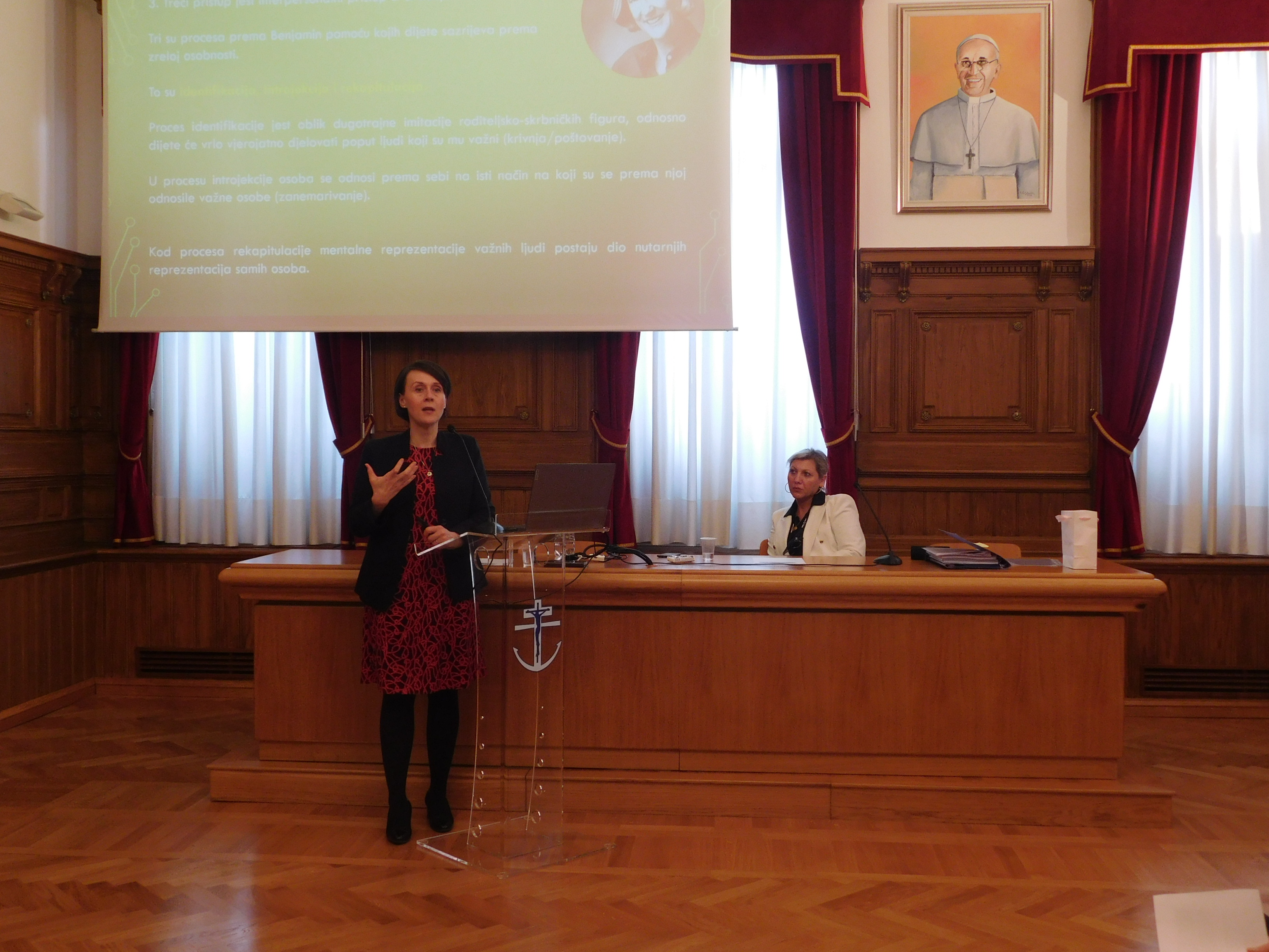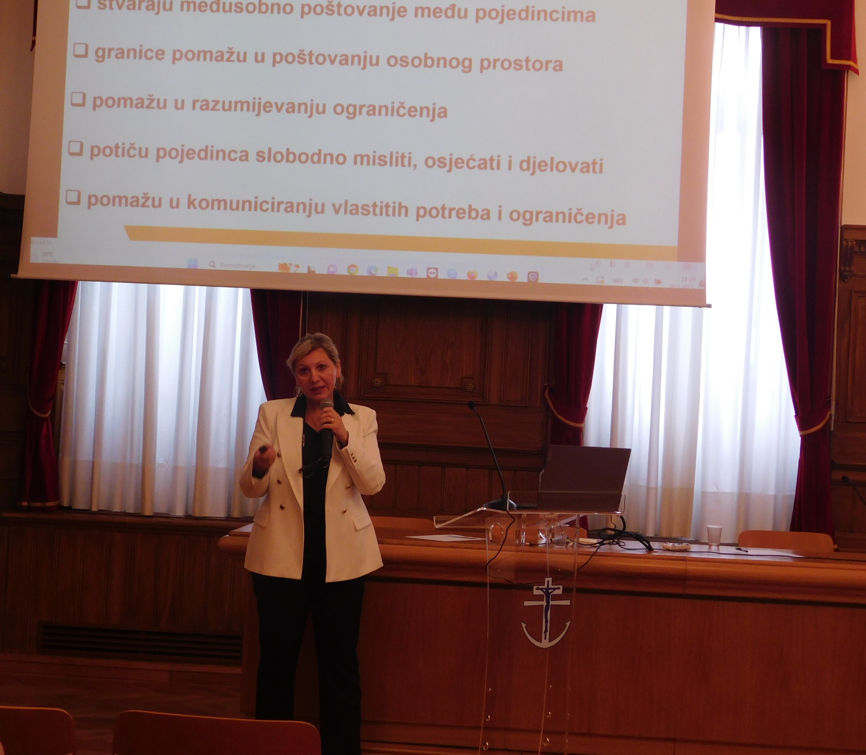 O temi “Dostojanstvo ljudske osobe – interdisciplinarni pristup“ je govorila stručna suradnica i supervizorica Centra dr. sc. Sanda Smoljo Dobrovoljski. Zatim je o temi „Granice u odnosima“ nastavila govoriti voditeljica Centra dr. sc. Anita Dučkić Sertić. Predavanja su bila ispunjena pitanjima i komentarima sudionika. Nakon kratke pauze je na red došlo predavanje “Vrste zlostavljanja; posljedice zlostavljanja; prepoznavanje rizičnih i zaštitnih čimbenika” koje je također održala voditeljica Centra. Predavanje je bilo popraćeno interaktivnom radionicom.