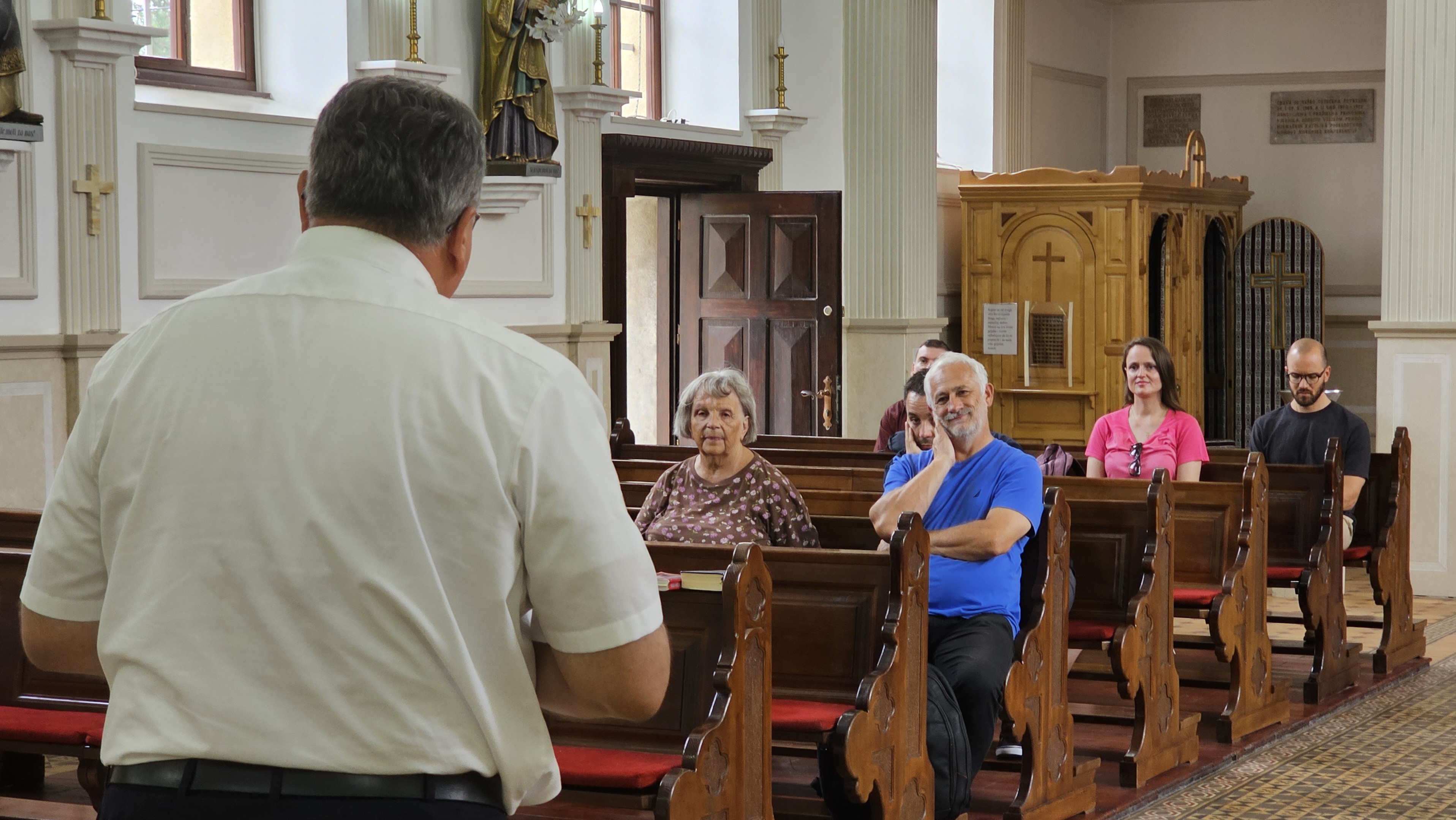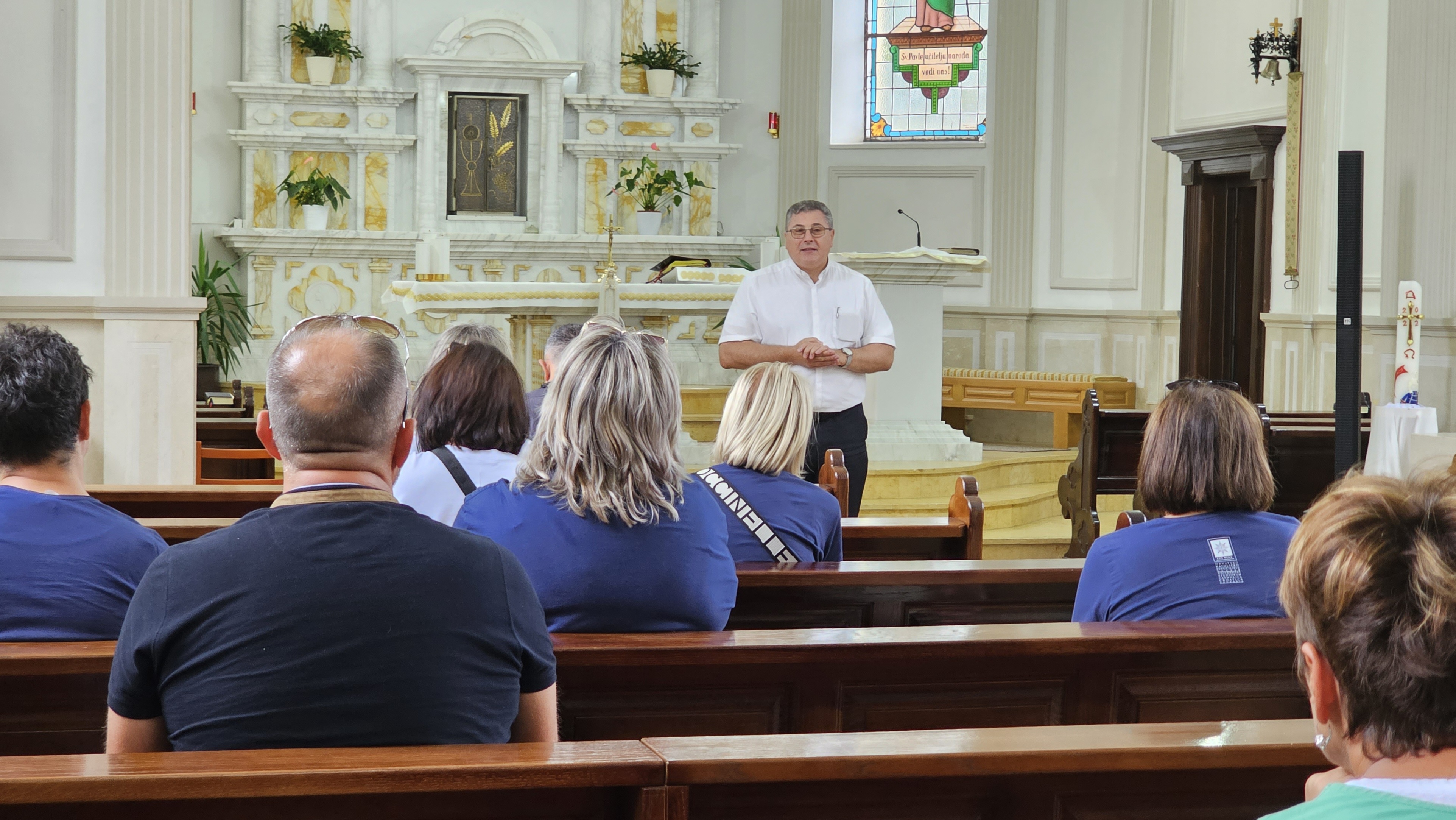 Sljedeća postaja hodočašća bila je župna crkva Pohoda Blažene Djevice Marije, gdje ih je sa zanimljovostima upoznao župnik vlč. Žarko Vladislav Ošap. Župa Banja Luka stara je barem koliko i ime grada, a pod tim se imenom grad prvi put spominje 1494. Fra Alojzije Mišić u petrićevačkom ljetopisu navodi da župa u Banjoj Luci postoji od 1503., a već 1495. spominju se u gradu redovnici, vjerojatno franjevci. Župa je više puta mijenjala sjedište. Na sadašnje mjesto, nekoć zvano Latinska Mahala, preneseno je 1859., kada je tu sagrađena župna kuća i skromna kapelica. Sadašnja župna crkva sagrađena je 1891. Nakon potresa 1969., koji ju je znatno oštetio, temeljito je obnovljena. Ponovno je oštećena 1992., ali je sve vrijeme najnovijih ratnih sukoba služila svojoj svrsi.